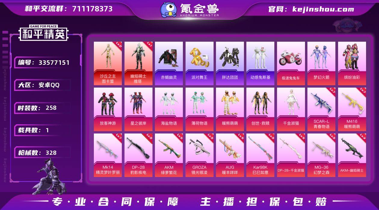 安卓【极品神装号/17王牌印记/沙丘之主-图卡盟(二级)/幽焰骑士-维塔(一级)/梦幻火箭/缤纷油彩/放客神游/赤蝎幽灵/派对舞王/胖达团团/暗影哥特/蓝螳螂/萌熊伴侣背包/2神装-9粉装-15特效枪-1载具-14粉色飞行器】 手Q--108679热力值-17王牌印记-258套装-328枪皮 【红色神装等级】:幽焰骑士-维塔(一级),沙丘之主-图卡盟(二级) 【红色角色神装】:幽焰骑士-维塔,沙丘之主-图卡盟 【热门品类】:粉装-梦幻火箭,粉装-缤纷油彩,套装-浪漫天命,套装-赤蝎幽灵,套装-派对舞王,套装-胖达团团,套装-动感兔斯基人偶服,套装-龟仙人,套装-暗影哥特,套装-浪漫波比,角色-Mark.06,套装-红熊茄茄 【粉色套装】:粉装-梦幻火箭,粉装-缤纷油彩,粉装-放客神游,粉装-星之彼岸,粉装-海盐物语,粉装-薄荷物语,粉装-暖熊萌萌,套装-创世·救赎,角色-千金淑猫 【粉色枪皮等级】:AKM-绿萝繁花(五级),AKM-幽焰骑士(三级),SCAR-L-青春物语(七级),M416-暖熊萌萌(七级),GROZA-镜光银凌(五级),AUG-暖羊咩咩(五级),P90-沙丘之主(三级),Kar98K-巳巳如意(五级),M24-镜域双华(二级),Mk14-精灵梦叶罗丽(七级),Mk14-福马献瑞(一级),SPAS-12-蜜语绒猫(三级),DP-28-千金淑猫(五级),DP-2...
