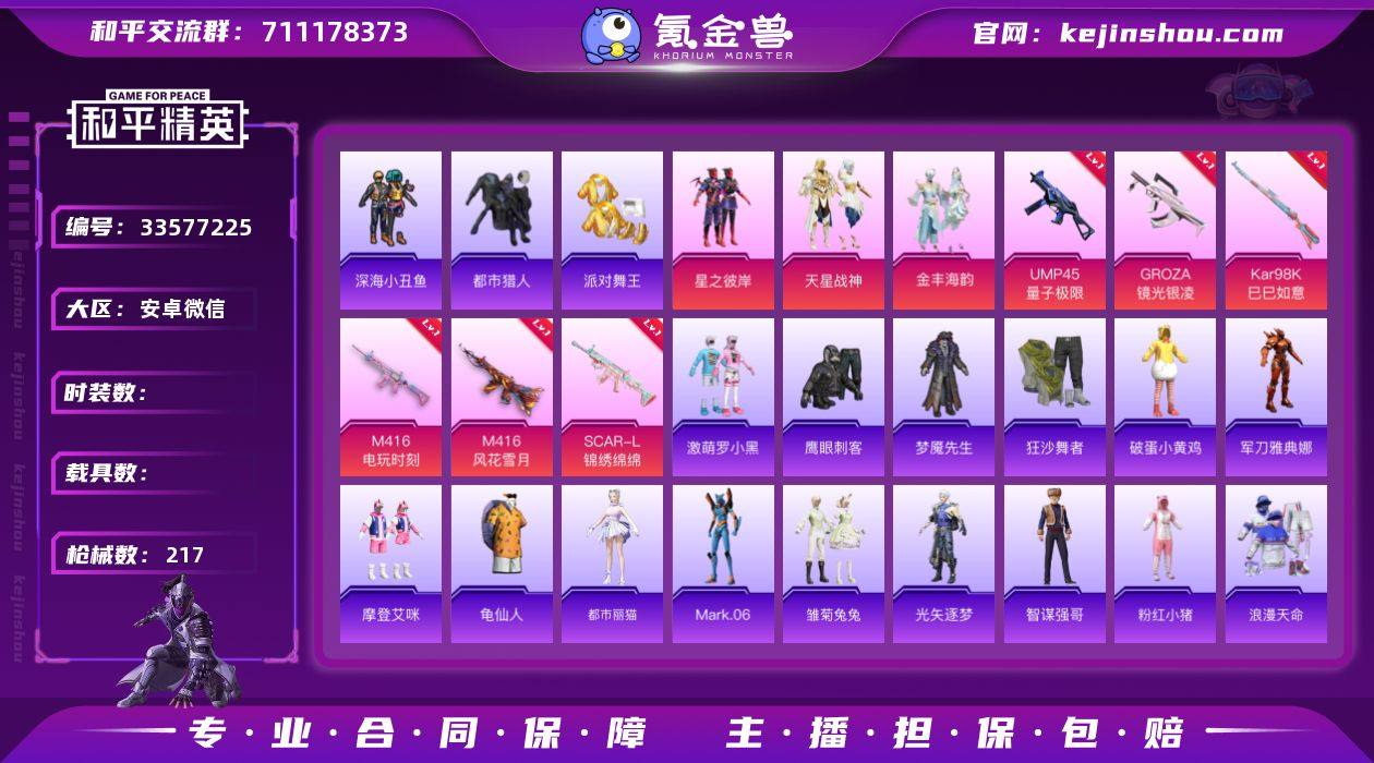 hs67848 安卓微信-8王牌印记-3粉装-9特效枪-68419热力值-166套装-217枪皮 【3粉装】套装-天星战神,套装-星之彼岸,套装-金丰海韵 【9特效枪】GROZA-镜光银凌/5级,UMP45-量子极限/5级,SCAR-L-锦绣绵绵/5级,DP-28-豹影疾电/5级,M416-风花雪月/7级,M416-电玩时刻/5级,Kar98K-巳巳如意/5级,AKS-74U-森灵之息/5级,Mk14-福马献瑞/4级 【7稀有紫装】都市猎人,Mark.06,派对舞王,深海小丑鱼,浪漫天命,小丑鱼,龟仙人 【166稀有时装】天星战神,金丰海韵,星之彼岸,都市猎人,浪漫天命,龟仙人,Mark.06,深海小丑鱼,小丑鱼,派对舞王,激萌罗小黑,狂沙舞者,萌趣咩咩,龙魂突击队, 暗影刺翼,小熊娃娃,都市丽猫,白糯汤圆,街头风暴,星途旅人,光矢逐梦,冰河战士,鱼渊荷华,青团波波,燕燕于飞,战术大师,智谋强哥,紫俏灵猫,雏菊兔兔,糖糖葫芦,香桃花海,蝶变,巳巳如意,曼妙人鱼,棉花软糖,琴音绮想,画境星梦,狂鲨锋刃,萌鸡速递,书海巡游,雪国风尚,青翼流星,马上来财,SS35特训,SS29特训,萝兰蝴蝶,SS31特训,SS32特训,SS16特训,SS36特训,焰鹰斗篷,醒狮腾龙,童真绒兔,福星高照,雪兔飞飞,虎虎生威吉莉,夏日音浪,军刀雅典娜,潮流炫酷,甜梦熊熊,SS37特训,SS28特训,特训学院,猎鹰,蓝色运动,白色伏地魔,热血青春,酒红...