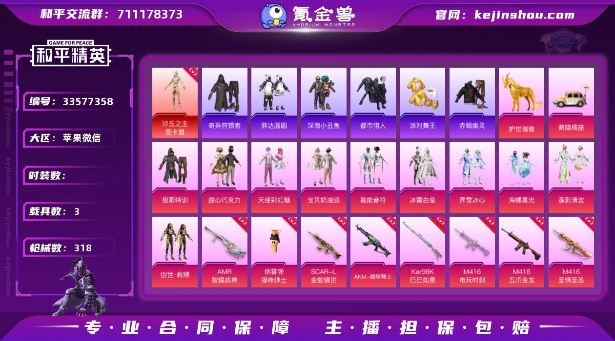 hs70124 苹果微信-21王牌印记-1红装-11粉装-22特效枪-3载具-热力值-223套装-318枪皮-4卓越印记-2传奇印记 【1红装】沙丘之主-图卡盟/2级 【11粉装】套装-宝贝奶油派,套装-莲影清波,套装-智能音符,套装-极限特训,套装-幻彩电音,套装-天使彩虹糖,套装-冰霜白皇,套装-甜心巧克力,套装-海螺星光,套装-创世·救赎,套装-霁雪冰心 【22特效枪】烟雾弹-猫咪绅士/5级,AMR-智耀战神/6级,P90-能量风暴/3级,M416-电玩时刻/5级,AKM-星际浪客/4级,P90-魔童闹海 敖丙/3级,UMP45-萌骑冒险/1级,SCAR-L-锦绣绵绵/5级,ACE32-萌骑漫游/5级,M416-五爪金龙/5级,M416-至情至圣/9级,SCAR-L-灵驹仙姬/2级,DP-28-豹影疾电/5级,Mk14-福马献瑞/5级,AKM-幽焰骑士/3级,M249-绒雪飘舞/7级,SCAR-L-金蛇镇世/3级,M24-翩跹演武/1级,P90-沙丘之主/3级,AKM-绿萝繁花/5级,AKS-74U-森灵之息/5级,Kar98K-巳巳如意/5级 【13稀有紫装】都市猎人,派对舞王,赤蝎幽灵,奇异狩猎者,暗影哥特,深海小丑鱼,浪漫天命,胖达圆圆,迅捷狂鲨,金羽特工,小丑鱼,龟仙人,萌熊伴侣背包(3级) 【3稀有载具】萌喵橘座,九霄玄鹿,护世瑞兽 【1僚机】僚机-萌兔起飞 【220稀有时装】图卡盟/2级,甜心巧克力,宝贝奶油派,天使彩虹糖,智能音符,极限特训,...