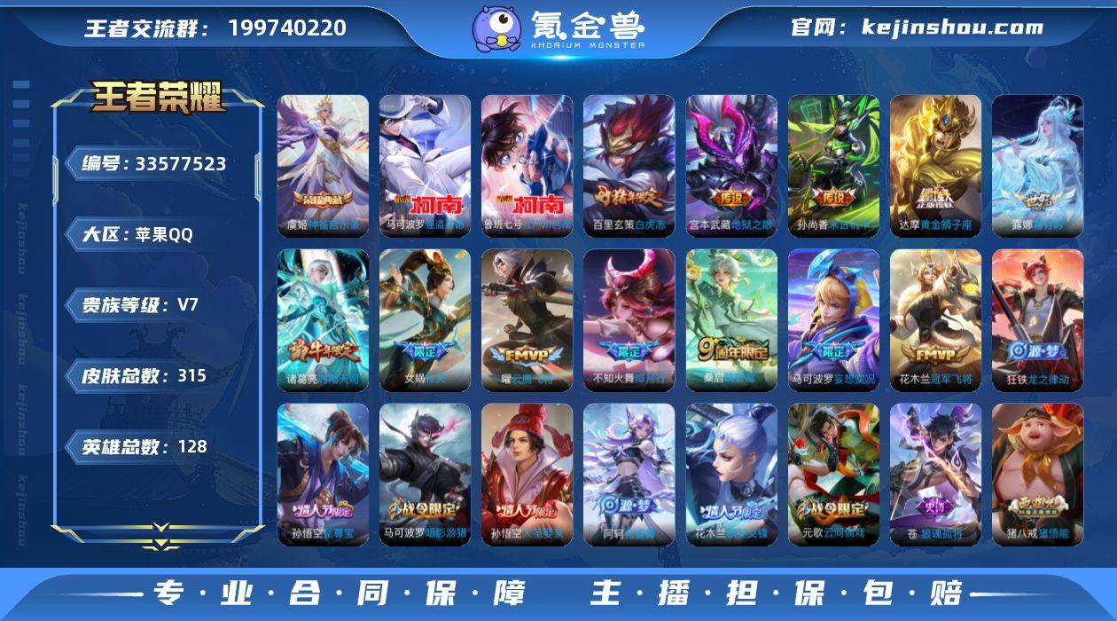 苹果QQ/最强王者/315皮肤/128英雄/1典藏/0珍品无双/0无双/2珍品传说/14传说/85史诗/9稀有英雄 【2 珍品传说】怪盗基德 马可波罗,江户川柯南 鲁班七号, 【1 典藏皮肤】神鉴启示录 虞姬, 【14 传说皮肤】白虎志 百里玄策,云鹰飞将 曜,补天 女娲,神骥·逐星野 马超,地狱之眼 宫本武藏,时雨天司 诸葛亮,霜月吟 露娜,黄金狮子座 达摩,绯月行 不知火舞,末日机甲 孙尚香,妄想实况 马可波罗,冠军飞将 花木兰,神树通天 后羿,鸣野蒿 桑启, 【85 史诗皮肤】电玩小子 鲁班七号,末日机甲 吕布,蔬乡物语 鲁班七号,紫霞仙子 露娜,高山流水 庄周,银河之约 李元芳,暗影游猎 马可波罗,苍穹之光 项羽,狮舞东方 鲁班七号,猫狗日记 大乔,德古拉伯爵 刘邦,心灵战警 亚瑟,无心 元歌,鬼剑武藏 宫本武藏,星夜王子 白起,无限星赏官 公孙离,线条小狗 周瑜,百晓客 明世隐,遇见飞天 杨玉环,摇滚巨星 嬴政,顽趣 梦奇,修罗 橘右京,黄金分割率 诸葛亮,偶像歌手 王昭君,荣光圣徽 蒙恬,女仆咖啡 妲己,星界游侠 暃,猪悟能 猪八戒,舞动绿茵 蔡文姬,繁星吟游 蔡文姬,暗夜贵公子 嬴政,鹰眼统帅 狄仁杰,大圣娶亲 孙悟空,李小龙 裴擒虎,龙骑士 墨子,金属风暴 墨子,逐梦之影 韩信,特工魅影 百里守约,猫狗日记 孙策,原初追...
