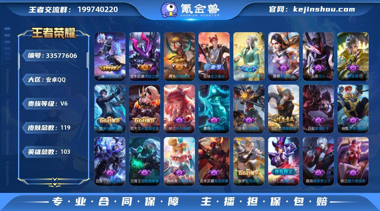 安卓QQ/永恒钻石/119皮肤/103英雄/0典藏/0珍品无双/0无双/1珍品传说/4传说/30史诗/6稀有英雄 【1 珍品传说】沧流箭 伽罗, 【4 传说皮肤】逐花归海 澜,神骥·逐星野 马超,地狱之眼 宫本武藏,战鼓燎原 典韦, 【30 史诗皮肤】末日机甲 吕布,紫霞仙子 露娜,天秀·启明 杨戬,无心 元歌,鬼剑武藏 宫本武藏,百相守梦 黄忠,星夜王子 白起,线条小狗 周瑜,魅力维加斯 妲己,女仆咖啡 妲己,赏金猎手 澜,九幽镇关 项羽,暗夜贵公子 嬴政,鹰眼统帅 狄仁杰,光弋星穹 莱西奥,特工魅影 百里守约,鸭鸭历险记 刘禅,魔术师 狄仁杰,龙之律动 狂铁,皇家上将 赵云,水晶猎龙者 花木兰,器灵·浮梦炉 赵怀真,织梦人 西施,曙光守护者 铠,箭羽风息 伽罗,百相守梦 周瑜,线条小狗 小乔,水果甜心 孙尚香,幽灵船长 曹操,暗隐猎兽者 兰陵王, 【59 勇者皮肤】时空谍影 海诺,爱心护理 阿轲,拳王 达摩,大发明家 达摩,铁甲之心 典韦,沉稳之力 孙尚香,黄金武士 典韦,阴阳师 狄仁杰,西部大镖客 牛魔,海滩派对 项羽,克喵 鬼谷子,踏浪烽翎 莱西奥,野性能量 吕布,哥特玫瑰 露娜,无双福将 程咬金,百相守梦 影,阿尔法小队 后羿,潮玩牛仔 马可波罗,救世之瞳 扁鹊,赤刃凌霄 敖隐,死亡骑士 亚瑟,掌控之力 诸葛亮,海滩丽影 钟无艳,...