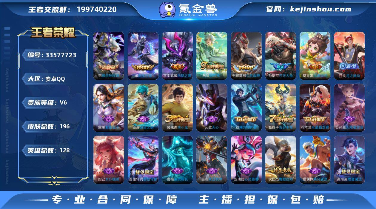 安卓QQ/永恒钻石/196皮肤/128英雄/1典藏/0珍品无双/0无双/0珍品传说/8传说/47史诗/8稀有英雄 【1 典藏皮肤】银白咏叹调 铠, 【8 传说皮肤】花朝如约 蔡文姬,逐花归海 澜,齐天大圣 孙悟空,神骥·逐星野 马超,地狱之眼 宫本武藏,久胜战神 干将莫邪,神树通天 后羿,鸣野蒿 桑启, 【47 史诗皮肤】末日机甲 吕布,紫霞仙子 露娜,高山流水 庄周,燃音魔法 高渐离,天秀·启明 杨戬,猫狗日记 大乔,德古拉伯爵 刘邦,五谷丰年 鬼谷子,无心 元歌,鬼剑武藏 宫本武藏,百相守梦 黄忠,无限星赏官 公孙离,线条小狗 周瑜,摇滚巨星 嬴政,偶像歌手 王昭君,女仆咖啡 妲己,九幽镇关 项羽,鹰眼统帅 狄仁杰,李小龙 裴擒虎,春霖将至 上官婉儿,金属风暴 墨子,特工魅影 百里守约,猫狗日记 孙策,逐浪之夏 李元芳,未来纪元 赵云,魔术师 狄仁杰,龙之律动 狂铁,皇家上将 赵云,功夫厨神 程咬金,梁祝 上官婉儿,圣诞恋歌 貂蝉,水晶猎龙者 花木兰,涂山容容 公孙离,破空之剑 亚连,星界战将 牛魔,节奏热浪 阿轲,曙光守护者 铠,万灵启世 女娲,心灵骇客 安琪拉,乱世虎臣 张飞,绅士熊喵 刘禅,缤纷独角兽 小乔,百相守梦 百里守约,线条小狗 小乔,水果甜心 孙尚香,幽灵船长 曹操,乘风破浪 夏侯惇, 【100 勇者皮肤】爱心护理 阿...