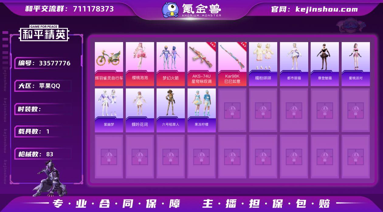hs68512 苹果手Q-4王牌印记-3粉装-4特效枪-1载具-25846热力值-51套装-83枪皮-1卓越印记 【3粉装】套装-梦幻火箭,套装-星穹咏叹调,角色-樱桃泡泡 【4特效枪】AKS-74U-星穹咏叹调/7级,Mk14-福马献瑞/1级,Kar98K-巳巳如意/1级,烟雾弹-甜梦果泡/5级 【1稀有载具】辉羽雀灵自行车 【50稀有时装】梦幻火箭,樱桃泡泡,星穹咏叹调,迅捷龙虾,六号稻草人,糯粉咩咩,都市丽猫,摩登魅猫,白糯汤圆,绒宝小鹅,星渊小夜曲,蜜桃派对,鱼渊荷华,大橘大利,燕燕于飞,战术大师,瑰梦爱神,粉恋花,果冻柠檬,星影赞美诗,狂鲨锋刃,炫彩糖果,小鸟芋圆,雪国风尚,蓝冰羽,恋语绒绒,青翼流星,紫幽梦,马上来财,SS35特训,SS31特训,SS33特训,SS32特训,SS36特训,粉彩缠枝,龙的传人,SS37特训,蝶吟花词,暖暖麦兜,SS34特训,街头潮人,魅力单车,玫瑰恋情,狙击之神,红釉青花,雨过天青,福马献瑞,缤纷果语,柠萌假日,懵萌河马 【81稀有枪械】Kar98K-巳巳如意/1级,Mk14-福马献瑞/1级,AKS-74U-星穹咏叹调/7级,烟雾弹-甜梦果泡/5级,S1897-精灵梦叶罗丽,Win94-乌木金纹,12-乌木金纹,PKM-紫幽梦,MG3-霓彩脉冲,Mk14-紫幽梦,蜜獾-乌木金纹,S1897-紫幽梦,P92-紫幽梦,SPAS-12-狂鲨锋刃,20-H-狂鲨锋刃,AUG-冰晶雪宝,铝热弹-炫彩糖果,UZI-...