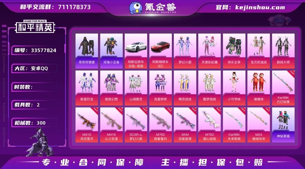 hs66992 安卓手Q-31王牌印记-15粉装-10特效枪-2载具-热力值-230套装-300枪皮 【15粉装】套装-酣梦娃娃,套装-精灵娃娃,角色-小可学妹,套装-流星咚咚,套装-数码大师,玩偶服-猪猪侠,套装-梦幻火箭,套装-极致幻想,角色-鸢尾珑雾,套装-新星烈龙,套装-天使彩虹糖,角色-初号机款机体服,套装-宝贝奶油派,套装-山涧鹿灵,套装-快乐主宰 【10特效枪】M762-甜蜜誓约/4级,M416-心之恋语/7级,Kar98K-未来歌姬/5级,DP-28-豹影疾电/4级,Kar98K-巳巳如意/5级,AKM-炫紫旋律/7级,SCAR-L-梦幻火箭/7级,M416-风花雪月/7级,M24-镜域双华/3级,M762-甜心娃娃/7级 【10稀有紫装】奇异狩猎者,深海小丑鱼,浪漫天命,雪山精英,浪漫波比,迅捷狂鲨,明日香款战斗服,小丑鱼,龟仙人,零款战斗服 【2稀有载具】特斯拉Model 3(珍珠白),阿斯顿·马丁DBS(红) 【228稀有时装】梦幻火箭,初号机款机体服,新星烈龙,宝贝奶油派,天使彩虹糖,小可学妹,极致幻想,猪猪侠,流星咚咚,精灵娃娃,酣梦娃娃,山涧鹿灵,快乐主宰,数码大师,浪漫天命,奇异狩猎者,龟仙人,雪山精英,深海小丑鱼,小丑鱼,迅捷狂鲨,零款战斗服,明日香款战斗服,浪漫波比,好奇恐龙,罗小黑,激萌罗小黑,暴走罗小黑,狂战萌兔,潮萌小黄鸭,神秘黑猫,软萌银虎,海上生明月,...