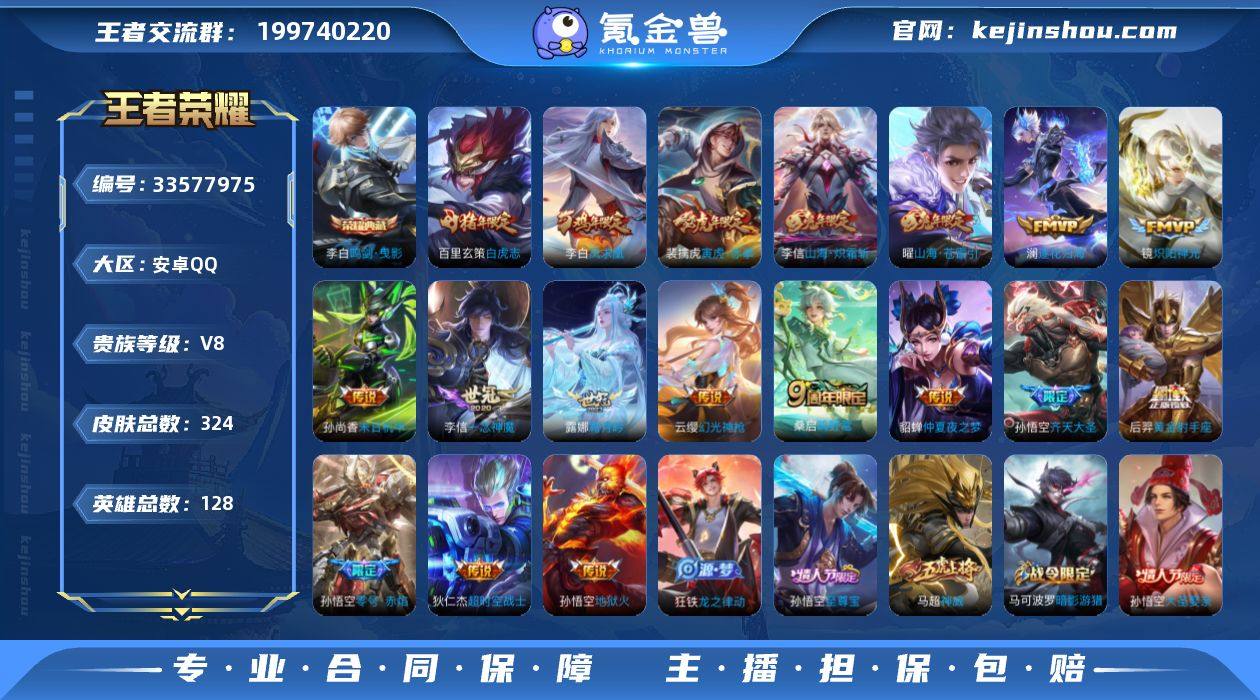 安卓QQ/永恒钻石/324皮肤/128英雄/1典藏/0珍品无双/0无双/1珍品传说/19传说/96史诗/8稀有英雄 【1 珍品传说】沧流箭 伽罗, 【1 典藏皮肤】鸣剑·曳影 李白, 【19 传说皮肤】启明星使 虞姬,逐花归海 澜,白虎志 百里玄策,零号·赤焰 孙悟空,地狱火 孙悟空,齐天大圣 孙悟空,凤求凰 李白,仲夏夜之梦 貂蝉,炽阳神光 镜,黄金射手座 后羿,霜月吟 露娜,末日机甲 孙尚香,山海·炽霜斩 李信,一念神魔 李信,寅虎·赤拳 裴擒虎,超时空战士 狄仁杰,山海·苍雷引 曜,幻光神枪 云缨,鸣野蒿 桑启, 【96 史诗皮肤】电玩小子 鲁班七号,末日机甲 吕布,紫霞仙子 露娜,高山流水 庄周,银河之约 李元芳,雪夜绮愿 周瑜,暗渊魔法 司马懿,暗影游猎 马可波罗,猫狗日记 大乔,妄想食味 姬小满,德古拉伯爵 刘邦,心灵战警 亚瑟,五谷丰年 鬼谷子,无心 元歌,鬼剑武藏 宫本武藏,迷踪丽影 阿轲,星夜王子 白起,线条小狗 周瑜,百晓客 明世隐,遇见飞天 杨玉环,摇滚巨星 嬴政,电玩高手 狂铁,顽趣 梦奇,修罗 橘右京,拒霜思 嫦娥,魅力维加斯 妲己,黄金分割率 诸葛亮,凤凰于飞 王昭君,偶像歌手 王昭君,荣光圣徽 蒙恬,女仆咖啡 妲己,赏金猎手 澜,星界游侠 暃,晚萤 娜可露露,舞动绿茵 蔡文姬,繁星吟游 蔡文姬,鹰眼统帅 狄仁杰,胡...
