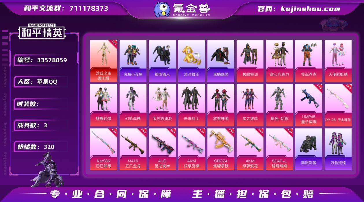 hs69090 苹果手Q-16王牌印记-1红装-12粉装-13特效枪-3载具-热力值-253套装-320枪皮-3卓越印记-1传奇印记 【1红装】沙丘之主-图卡盟/3级 【12粉装】套装-星之彼岸,套装-宝贝奶油派,套装-天使彩虹糖,套装-怪诞乔克,套装-极限特训,套装-蝶舞迷情,角色-荧海星豚,套装-放客神游,套装-未来战士,套装-幻影战神,套装-甜心巧克力,角色-千金淑猫 【13特效枪】Mk14-福马献瑞/5级,SCAR-L-锦绣绵绵/5级,DP-28-千金淑猫/7级,UMP45-量子极限/5级,Kar98K-巳巳如意/1级,AUG-星之彼岸/7级,M416-灵猫魔法师/3级,DP-28-豹影疾电/1级,GROZA-焦糖拿铁/7级,M416-五爪金龙/7级,AKM-炫紫旋律/7级,SCAR-L-魔童闹海 哪吒/3级,AKM-绿萝繁花/5级 【13稀有紫装】都市猎人,Mark.06,派对舞王,2P战斗服款,赤蝎幽灵,深海小丑鱼,浪漫天命,雪山精英,东方飞龙,金羽特工,小丑鱼,龟仙人,萌熊伴侣背包(3级) 【3稀有载具】暮色幽蹄,黑曜夜骑,冰绡玉鳞 【252稀有时装】图卡盟/3级,甜心巧克力,怪诞乔克,放客神游,宝贝奶油派,天使彩虹糖,蝶舞迷情,极限特训,千金淑猫,幻影战神,荧海星豚,未来战士,星之彼岸,迅捷龙虾,SS38特训,都市猎人,浪漫天命,龟仙人,Mark.06,雪山精英,深海小丑鱼,小丑鱼,东方飞龙,金羽特工,赤蝎幽灵,派对...
