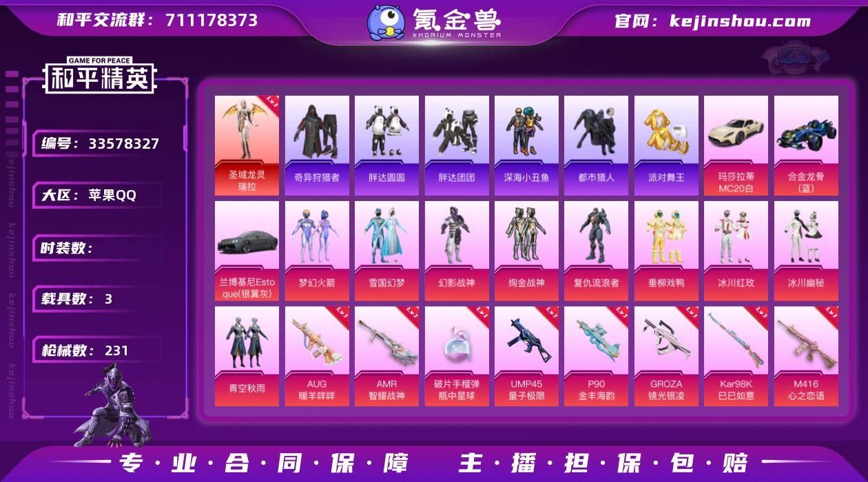hs65228 苹果手Q-16王牌印记-1红装-11粉装-14特效枪-3载具-87643热力值-170套装-231枪皮-2卓越印记 【1红装】圣域龙灵-瑞拉/1级 【11粉装】角色-复仇流浪者,套装-冰川红玫,套装-冰川幽秘,套装-青空秋雨,套装-幻影战神,角色-初号机款机体服,套装-梦幻火箭,套装-雪国幻梦,角色-千金淑猫,套装-垂柳戏鸭,套装-绚金战神 【14特效枪】SCAR-L-梦幻火箭/6级,AKM-梦之光华/5级,P90-金丰海韵/6级,M16A4-垂柳戏鸭/2级,UMP45-量子极限/5级,M416-心之恋语/7级,GROZA-镜光银凌/5级,DP-28-豹影疾电/5级,AUG-暖羊咩咩/5级,破片手榴弹-瓶中星球/5级,AMR-智耀战神/4级,Kar98K-巳巳如意/5级,AWM-花间之火/5级,Mk14-福马献瑞/5级 【15稀有紫装】都市猎人,派对舞王,奇异狩猎者,暗影哥特,深海小丑鱼,浪漫天命,胖达圆圆,浪漫波比,迅捷狂鲨,胖达团团,明日香款战斗服,小丑鱼,龟仙人,许七安,萌熊伴侣背包(3级) 【3稀有载具】兰博基尼Estoque(银翼灰),玛莎拉蒂MC20(星石白),合金龙骨(蓝) 【170稀有时装】瑞拉/1级,雪国幻梦,梦幻火箭,初号机款机体服,绚金战神,千金淑猫,幻影战神,复仇流浪者,垂柳戏鸭,冰川幽秘,冰川红玫,青空秋雨,都市猎人,胖达团团,浪漫天命,奇异狩猎者,龟仙人,暗影哥特,深海小丑鱼,小丑...