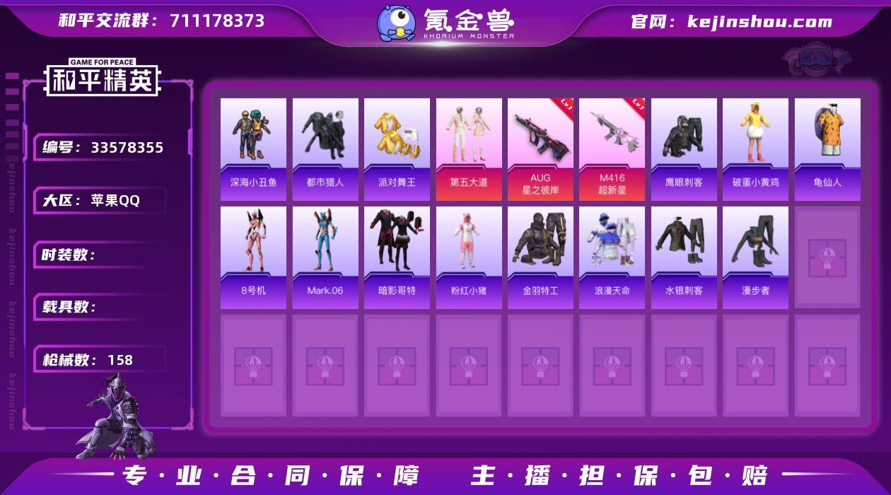 hs69174 苹果手Q-4王牌印记-4粉装-6特效枪-46254热力值-119套装-158枪皮-1卓越印记 【4粉装】角色-初号机 觉醒Ver.,角色-异瞳寒姬,角色-阿尔茜,套装-第五大道 【6特效枪】AUG-星之彼岸/7级,Mk14-福马献瑞/5级,AKS-74U-森灵之息/5级,M416-超新星/3级,ACE32-萌骑漫游/5级,DP-28-豹影疾电/5级 【9稀有紫装】都市猎人,Mark.06,8号机,派对舞王,暗影哥特,深海小丑鱼,浪漫天命,金羽特工,龟仙人 【119稀有时装】初号机 觉醒Ver.,第五大道,阿尔茜,异瞳寒姬,迅捷龙虾,SS38特训,都市猎人,浪漫天命,龟仙人,Mark.06,暗影哥特,深海小丑鱼,8号机,金羽特工,派对舞王,萌趣咩咩,龙魂突击队,白糯汤圆,星渊小夜曲,创世·追猎,战术大师,紫俏灵猫,香桃花海,曼妙人鱼,午间小调,琴音绮想,画境星梦,朱霞炽焰,狂鲨锋刃,凌霄紫焰,粉黛兰香,云魄琉璃,萌鸡速递,书海巡游,风迹短诗,雪国风尚,恋语绒绒,青翼流星,马上来财,SS35特训,SS31特训,SS33特训,SS32特训,SS36特训,贝斯之夜,龙的传人,SS37特训,SS28特训,特训学院,猎鹰,青年教官,橘黑制服,红色运动,黄色运动,蓝色运动,黄色伏地魔,白色伏地魔,酒红色名流,湖蓝色名流,黄色名流,SS26特训,漫步者,热情海星,黑色伏地魔,黎明保卫者,纯真浪花,SS34特训,竞技名士,深...
