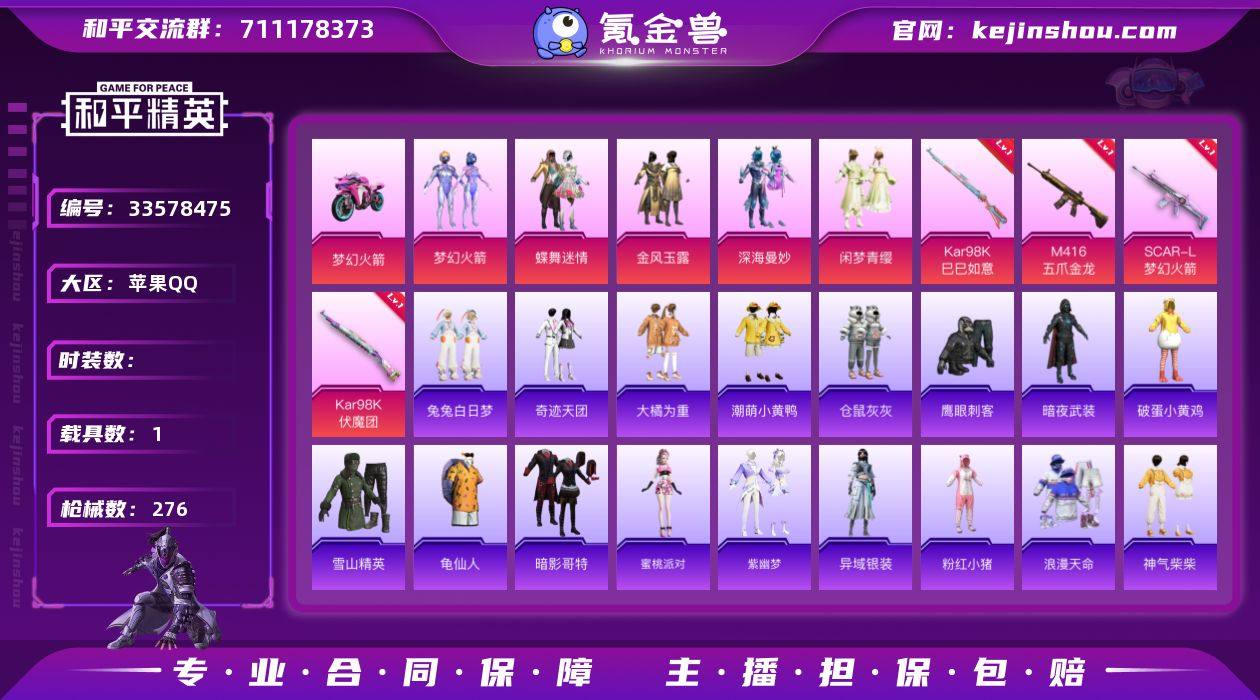 hs69140 苹果手Q-8王牌印记-6粉装-8特效枪-1载具-86852热力值-192套装-276枪皮-1卓越印记 【6粉装】套装-闲梦青缨,角色-荧海星豚,套装-梦幻火箭,套装-深海曼妙,套装-金风玉露,套装-蝶舞迷情 【8特效枪】AKS-74U-森灵之息/4级,SCAR-L-梦幻火箭/7级,Mk14-福马献瑞/5级,AA12-G-萌骑幻想/5级,DP-28-豹影疾电/5级,Kar98K-伏魔团/6级,Kar98K-巳巳如意/5级,M416-五爪金龙/7级 【4稀有紫装】暗影哥特,浪漫天命,雪山精英,龟仙人 【1稀有载具】双人摩托-梦幻火箭 【190稀有时装】梦幻火箭,蝶舞迷情,荧海星豚,闲梦青缨,深海曼妙,金风玉露,迅捷龙虾,SS38特训,浪漫天命,龟仙人,雪山精英,暗影哥特,大橘为重,兔兔白日梦,仓鼠灰灰,潮萌小黄鸭,龙魂突击队,异域银装,白糯汤圆,星渊小夜曲,星途旅人,蜜桃派对,鱼渊荷华,TT战队服,青团波波,大橘大利,燕燕于飞,AG战队服,NV战队服,战术大师,马上有钱,糖糖葫芦,香桃花海,元素星魂,时希公主,琴音绮想,画境星梦,星影赞美诗,朱霞炽焰,喜羊羊,凌霄紫焰,云魄琉璃,元气之梦,蜜露汐语,漫游都市,薄荷星砂,蓝冰羽,恋语绒绒,青翼流星,紫幽梦,SS35特训,迷域探索者,机械征服者,SS29特训,SS5特训,SS31特训,冰原使者,SS33特训,SS32特训,SS16特训,华灯初上,暴风机械师,...