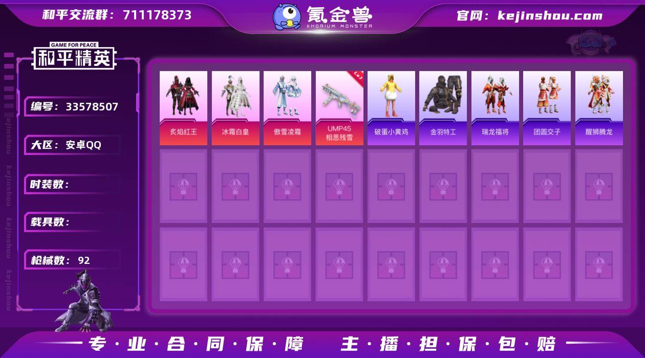 【92稀有枪械】Mk14-福马献瑞/5级,UMP45-相思残雪/7级,GROZA-无面战甲,Win94-乌木金纹,12-乌木金纹,SPAS-12-狂鲨锋刃,20-H-狂鲨锋刃,AUG-冰晶雪宝,UZI-炫彩糖果,AKS-74U-乌木金纹,M249-无面战甲,MG-36-薄荷星砂,P1911-无面战甲,M416-红色方程式,M416-糯团青竹,AKM-生命誓言,AKM-虎虎生威,AKM-萌趣颜团子,SCAR-L-玉兔迎春,SCAR...