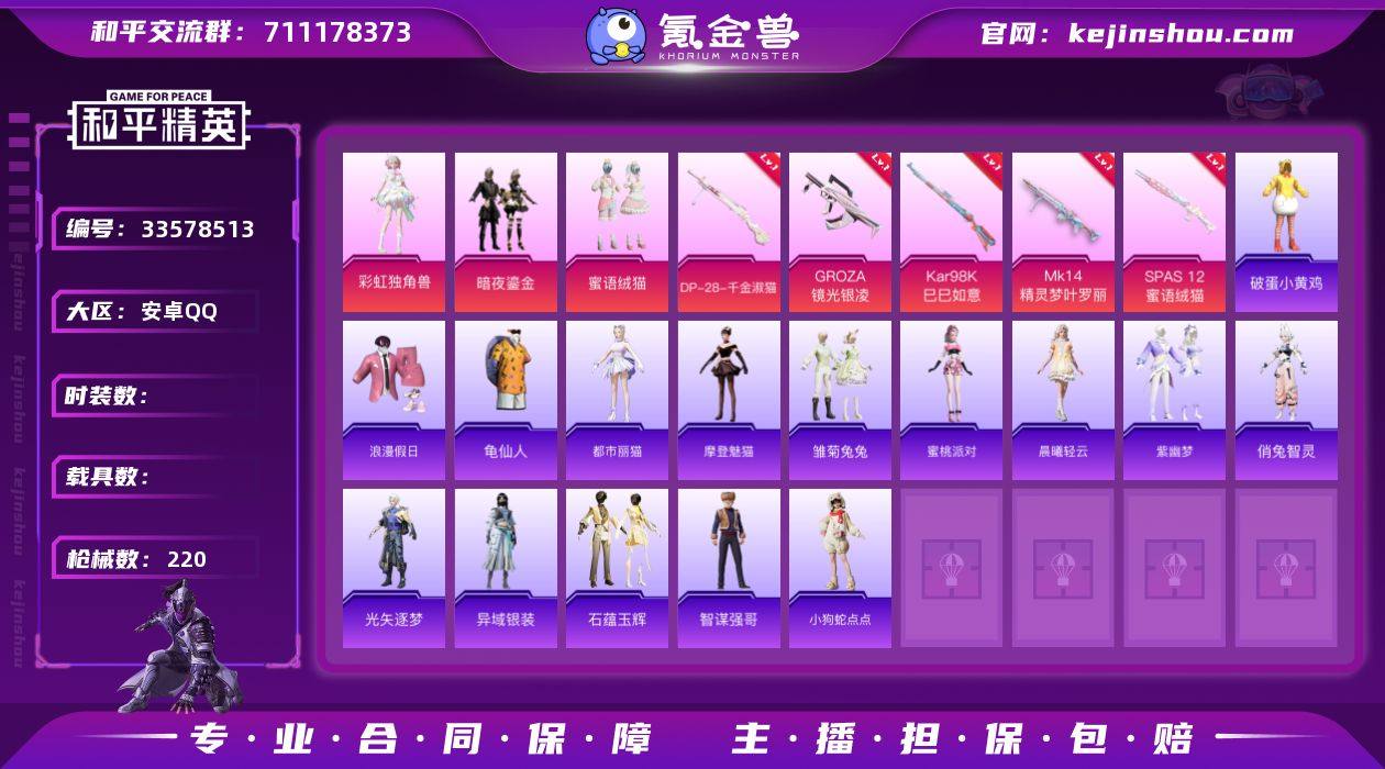 hs68101安卓手Q-9王牌印记-7粉装-9特效枪-62729热力值-161套装-220枪皮-6卓越印记-3传奇印记 【7粉装】角色-彩虹独角兽,角色-异瞳寒姬,角色-荧海星豚,套装-蜜语绒猫,套装-暗夜鎏金,角色-智耀战神,角色-千金淑猫 【9特效枪】DP-28-千金淑猫/5级,ACE32-萌骑漫游/4级,Mk14-福马献瑞/2级,Kar98K-巳巳如意/5级,SPAS-12-蜜语绒猫/6级,Mk14-精灵梦叶罗丽/6级,GROZA-镜光银凌/5级,DP-28-豹影疾电/5级,12-雪月幻音/3级 【1稀有紫装】龟仙人 【161稀有时装】千金淑猫,彩虹独角兽,智耀战神,荧海星豚,蜜语绒猫,异瞳寒姬,暗夜鎏金,迅捷龙虾,SS38特训,龟仙人,自由猎手,萌趣咩咩,石蕴玉辉,龙魂突击队,小熊娃娃,摩登天骄,异域银装,先驱飞行员,绿洲跃动,都市丽猫,摩登魅猫,白糯汤圆,绒宝小鹅,星渊小夜曲,街头风暴,星途旅人,光矢逐梦,航行童话,蜜桃派对,冰河战士,鱼渊荷华,俏兔智灵,青团波波,大橘大利,燕燕于飞,碧青流霞,战术大师,智谋强哥,碧波椰影,雏菊兔兔,馥郁金蕊,幽雨猫猫,马上有钱,暗械蛇影,糖糖葫芦,小狗蛇点点,熊抱抱,香桃花海,蝶变,巳巳如意,粉恋花,棉花软糖,元素星魂,午间小调,彩虹兔,琴音绮想,夜幕侵蚀,雪绒豹,画境星梦,星影赞美诗,乐游熊熊,朱霞炽焰,狂鲨锋刃,夜瞳黯灵,喜羊羊,游乐...