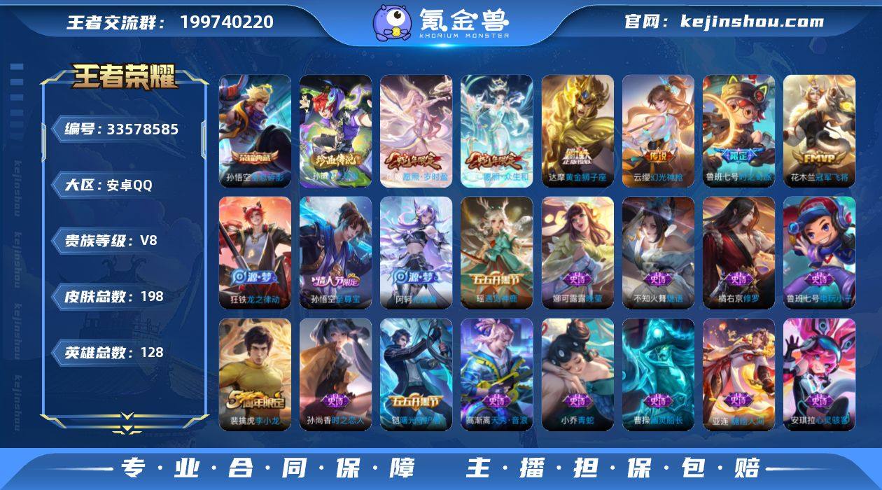 安卓QQ/尊贵铂金/198皮肤/128英雄/1典藏/0珍品无双/0无双/1珍品传说/10传说/56史诗/8稀有英雄 【1 珍品传说】时之奇旅 孙策, 【1 典藏皮肤】全息碎影 孙悟空, 【10 传说皮肤】启明星使 虞姬,神骥·赴朔漠 狄仁杰,异界灵契 花木兰,时之奇旅 鲁班七号,黄金狮子座 达摩,冠军飞将 花木兰,愿照·众生和 妲己,神树通天 后羿,幻光神枪 云缨,愿照·岁时盈 虞姬, 【56 史诗皮肤】电玩小子 鲁班七号,百解令 蒙犽,匿光决锋者 夏侯惇,天秀·音浪 高渐离,糖绘人间 亚连,德古拉伯爵 刘邦,心灵战警 亚瑟,巫礼祀神 少司缘,鬼剑武藏 宫本武藏,星夜王子 白起,锁墨魂 钟馗,线条小狗 周瑜,遇见飞天 杨玉环,修罗 橘右京,黄金分割率 诸葛亮,乐园奇幻夜 钟馗,偶像歌手 王昭君,晚萤 娜可露露,遇见神鹿 瑶,舞动绿茵 蔡文姬,繁星吟游 蔡文姬,鹰眼统帅 狄仁杰,玫瑰异探 镜,李小龙 裴擒虎,纤云弄巧 云中君,降魔 墨子,匿光侦查者 李元芳,特工魅影 百里守约,猫狗日记 孙策,未来纪元 赵云,魔术师 狄仁杰,龙之律动 狂铁,皇家上将 赵云,至尊宝 孙悟空,功夫厨神 程咬金,梁祝 上官婉儿,电玩·爆裂旋风 刘禅,圣诞恋歌 貂蝉,涂山容容 公孙离,圣诞狂欢 吕布,魅语 不知火舞,火炮绅士 黄忠,青蛇 小乔,月团寄思 沈梦溪,节奏热...