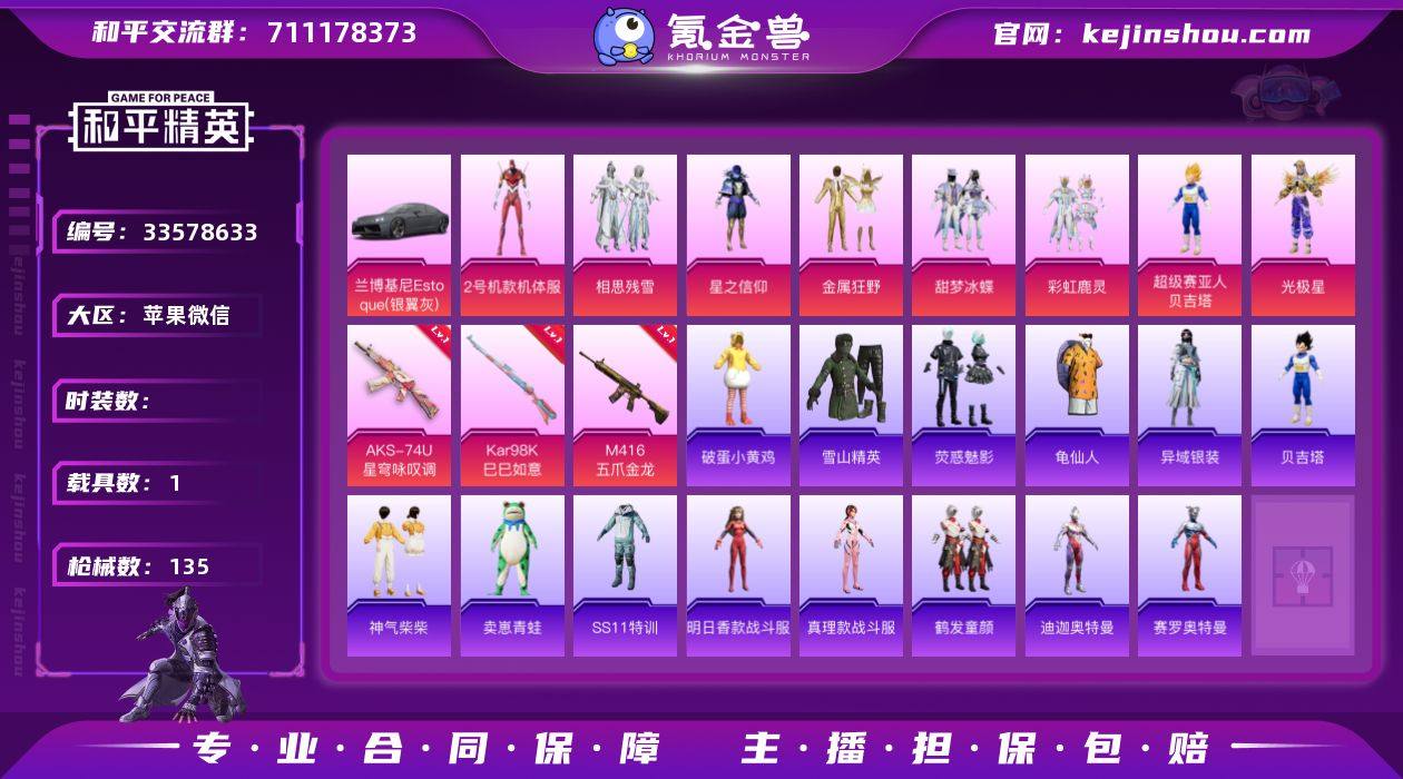 hs69284 苹果微信-20王牌印记-9粉装-5特效枪-1载具-50285热力值-132套装-135枪皮-10卓越印记-1传奇印记 【9粉装】超级赛亚人-孙悟空,套装-彩虹鹿灵,套装-甜梦冰蝶,套装-金属狂野,套装-星之信仰,角色-2号机款机体服,角色-光极星,套装-相思残雪,套装-星穹咏叹调 【5特效枪】DP-28-豹影疾电/5级,M416-五爪金龙/7级,Kar98K-巳巳如意/5级,Mk14-福马献瑞/1级,AKS-74U-星穹咏叹调/7级 【4稀有紫装】雪山精英,明日香款战斗服,龟仙人,真理款战斗服 【1稀有载具】兰博基尼Estoque(银翼灰) 【133稀有时装】2号机款机体服,星之信仰,彩虹鹿灵,光极星,金属狂野,星穹咏叹调,甜梦冰蝶,孙悟空,贝吉塔,相思残雪,迅捷龙虾,SS38特训,龟仙人,雪山精英,明日香款战斗服,龙魂突击队,卖崽青蛙,异域银装,街头风暴,星途旅人,冰河战士,战术大师,真理款战斗服,蝶变,巳巳如意,月烬之祷,狂鲨锋刃,炫彩糖果,萌鸡速递,元气之梦,薄荷星砂,顶瓜瓜,雪国风尚,恋语绒绒,青翼流星,SS35特训,SS29特训,SS31特训,SS33特训,SS32特训,SS16特训,华灯初上,SS36特训,决胜时刻,焰山流火,银河圣歌,闪耀星光,福星高照,虎虎生威吉莉,夏日音浪,龙的传人,甜梦熊熊,青玉碎影,萌黄之夏,SS37特训,海滨突袭者,SS28特训,S6赛事,青年教官,...
