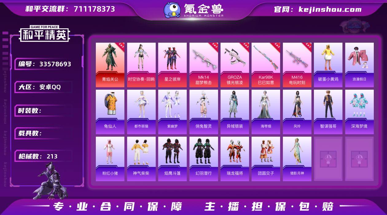hs64918 安卓手Q-12王牌印记-1红装-5粉装-5特效枪-67109热力值-161套装-213枪皮-1卓越印记 【1红装】角色-青焰关公/4级 【5粉装】时空协奏·回响,角色-千金淑猫,套装-星之彼岸,角色-羊梦糖心,角色-信仰神谕 【5特效枪】Kar98K-巳巳如意/5级,GROZA-镜光银凌/5级,M416-电玩时刻/5级,Mk14-甜梦熊击/5级,DP-28-豹影疾电/5级 【1稀有紫装】龟仙人 【161稀有时装】青焰关公/4级,羊梦糖心,SS35特训,午间小调,SS31特训,SS33特训,SS32特训,SS36特训,蓝冰羽,乐音,恋语绒绒,SS34特训,朱霞炽焰,紫幽梦,大橘大利,龟仙人,紫俏灵猫,凌霄紫焰,粉黛兰香,擎苍青焰,炫彩糖果,绯色魅影,萌鸡速递,小鸟芋圆,元气之梦,风迹短诗,猎影月神,薄荷星砂,秘语星愿,顶瓜瓜,时空协奏·回响,千金淑猫,信仰神谕,星之彼岸,龙魂突击队,异域银装,都市丽猫,白糯汤圆,绒宝小鹅,街头风暴,星途旅人,炽纹蛇影,冰河战士,焰舞炽心,鱼渊荷华,俏兔智灵,裁决天象,SS30特训,青团波波,燕燕于飞,海琴烟,梦域神使,风玲,战术大师,智谋强哥,暗械蛇影,糖糖葫芦,香桃花海,蝶变,巳巳如意,SS28特训,SS29特训,SS16特训,华灯初上,暴风机械师,时空追击者,明鸳圣池,贝斯之夜,焰鹰斗篷,金鼠迎春,福星高照,幻世猎手,虎虎生威吉莉,夏日音浪,龙的传...