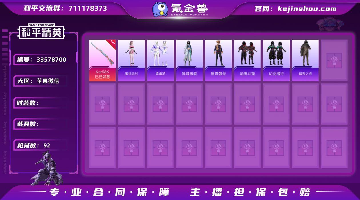 hs58547 苹果微信-2王牌印记-3特效枪-25118热力值-78套装-92枪皮-2卓越印记-1传奇印记 【3特效枪】12-雪月幻音/5级,Kar98K-巳巳如意/5级,DP-28-豹影疾电/5级 【78稀有时装】龙魂突击队,异域银装,星途旅人,蜜桃派对,鱼渊荷华,大橘大利,燕燕于飞,战术大师,智谋强哥,香桃花海,蝶变,巳巳如意,粉恋花,湖畔霞光,元素星魂,游乐,粉黛兰香,云魄琉璃,萌鸡速递,元气之梦,蓝海鲸歌,顶瓜瓜,蓝冰羽,恋语绒绒,紫幽梦,SS35特训,SS31特训,SS33特训,SS32特训,焰鹰斗篷,白熊同盟,青玉碎影,特训学院,猎鹰,青年教官,橘黑制服,红色运动,黄色运动,蓝色运动,黄色伏地魔,白色伏地魔,酒红色名流,湖蓝色名流,黄色名流,野性山猫,黑色伏地魔,SS34特训,深蓝色名流,猛禽,SS30特训,特战装甲,旭日情侣,街头潮人,冷焰舞者,魅力单车,生化防暴队,完美偶像,幻影武者,疯狂小兔子,蓝彩潮人,绮丽涂鸦,耀眼新星,竞技达人朋克,海岛探路者,破晓战魂,都市魅力,萌趣颜团子,耀粉歌者,SS27特训,牛气冲天,光之冒险,SS21特训,缤纷果语,幻羽潜行,海盐绵绵冰,王牌教练,暗夜之虎,鹤鸣 【91稀有枪械】Kar98K-巳巳如意/5级,DP-28-豹影疾电/5级,12-雪月幻音/5级,DBS-乌木金纹,SCAR-L-海盐豹豹,UZI-冰河战士,M16A4-冰河战士,20-H-乌木金...