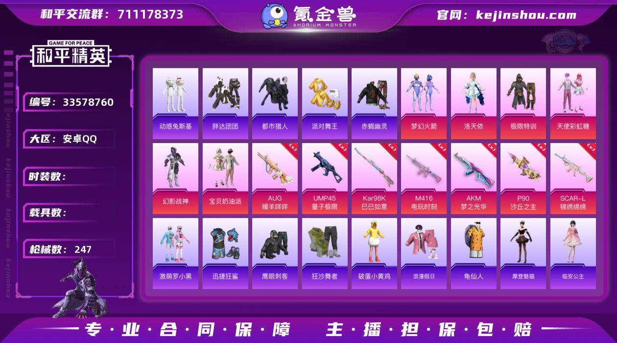 hs69413 安卓手Q-17王牌印记-8粉装-13特效枪-75649热力值-175套装-247枪皮-5卓越印记-2传奇印记 【8粉装】角色-洛天依,角色-罗征,角色-千金淑猫,套装-幻影战神,套装-宝贝奶油派,套装-梦幻火箭,套装-极限特训,套装-天使彩虹糖 【13特效枪】ACE32-萌骑漫游/5级,UMP45-量子极限/5级,AKS-74U-森灵之息/5级,Mk14-福马献瑞/5级,AUG-暖羊咩咩/5级,破片手榴弹-贪吃小熊/7级,M416-电玩时刻/5级,Kar98K-巳巳如意/5级,AA12-G-萌骑幻想/5级,DP-28-豹影疾电/5级,AKM-梦之光华/7级,P90-沙丘之主/3级,SCAR-L-锦绣绵绵/5级 【11稀有紫装】都市猎人,Mark.06,8号机,派对舞王,赤蝎幽灵,浪漫天命,迅捷狂鲨,胖达团团,小丑鱼,龟仙人,临安公主 【174稀有时装】梦幻火箭,宝贝奶油派,天使彩虹糖,洛天依,极限特训,千金淑猫,幻影战神,罗征,创世·幻影,SS38特训,都市猎人,胖达团团,浪漫天命,龟仙人,Mark.06,小丑鱼,8号机,迅捷狂鲨,赤蝎幽灵,派对舞王,激萌罗小黑,动感兔斯基人偶服,狂沙舞者,Alan Walker,粉团憨憨,萌趣咩咩,龙魂突击队,小熊娃娃,异域银装,摩登魅猫,白糯汤圆,星渊小夜曲,街头风暴,星途旅人,光矢逐梦,冰河战士,鱼渊荷华,青团波波,大橘大利,燕燕于飞,临安公主,战术大师,智谋强哥,雏菊兔兔,马上有...