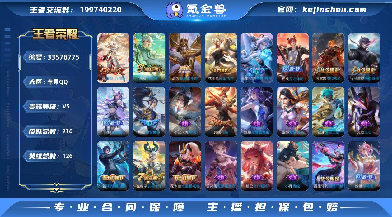 苹果QQ/至尊星耀/216皮肤/126英雄/0典藏/0珍品无双/0无双/0珍品传说/5传说/53史诗/8稀有英雄 【5 传说皮肤】黄金射手座 后羿,冠军飞将 花木兰,愿照·九州拓 澜,神树通天 后羿,鸣野蒿 桑启, 【53 史诗皮肤】末日机甲 吕布,紫霞仙子 露娜,百解令 蒙犽,高山流水 庄周,暗影游猎 马可波罗,德古拉伯爵 刘邦,五谷丰年 鬼谷子,无心 元歌,鬼剑武藏 宫本武藏,百相守梦 黄忠,迷踪丽影 阿轲,星夜王子 白起,无限星赏官 公孙离,地狱燃心 司空震,摇滚巨星 嬴政,拒霜思 嫦娥,魅力维加斯 妲己,女仆咖啡 妲己,鹰眼统帅 狄仁杰,飞衡 韩信,纤云弄巧 云中君,金属风暴 墨子,傲雪梅枪 韩信,特工魅影 百里守约,原初追逐者 百里玄策,雪豹·霜爪 百里守约,鸭鸭历险记 刘禅,龙之律动 狂铁,顽岩魄 蒙犽,皇家上将 赵云,电玩·爆裂旋风 刘禅,圣诞恋歌 貂蝉,水晶猎龙者 花木兰,破空之剑 亚连,魅语 不知火舞,夏日便利店 蔡文姬,地狱岩魂 廉颇,茶境仙 孙膑,蔷薇恋人 孙尚香,冰雪圆舞曲 甄姬,青蛇 小乔,月团寄思 沈梦溪,节奏热浪 阿轲,曙光守护者 铠,心灵骇客 安琪拉,百相守梦 周瑜,绅士熊喵 刘禅,百相守梦 百里守约,水果甜心 孙尚香,化蝶舞 阿轲,江河有灵 阿古朵,幽灵船长 曹操,暗隐猎兽者 兰陵王, 【126 勇者皮肤...