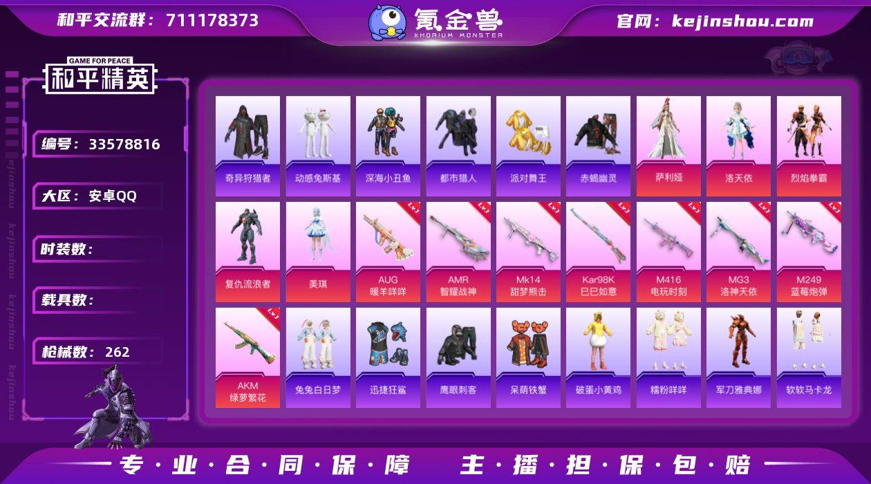 hs69351 安卓手Q-17王牌印记-9粉装-12特效枪-83611热力值-226套装-262枪皮-3卓越印记 【9粉装】角色-洛天依,角色-萨利娅,角色-荧海星豚,角色-光谕先知,角色-虎痴许褚,套装-烈焰拳霸,角色-复仇流浪者,角色-月中灵,角色-美琪 【12特效枪】MG3-洛神天依/4级,AMR-智耀战神/6级,Mk14-福马献瑞/5级,Kar98K-巳巳如意/4级,M249-蓝莓炮弹/7级,AKM-绿萝繁花/5级,AKS-74U-森灵之息/5级,UMP45-萌骑冒险/4级,DP-28-豹影疾电/1级,Mk14-甜梦熊击/5级,AUG-暖羊咩咩/5级,M416-电玩时刻/5级 【11稀有紫装】都市猎人,派对舞王,赤蝎幽灵,2B战斗服款,奇异狩猎者,暗影哥特,深海小丑鱼,浪漫天命,迅捷狂鲨,小丑鱼,龟仙人 【221稀有时装】洛天依,月中灵,荧海星豚,虎痴许褚,复仇流浪者,萨利娅,烈焰拳霸,美琪,迅捷龙虾,SS38特训,都市猎人,浪漫天命,奇异狩猎者,龟仙人,暗影哥特,深海小丑鱼,小丑鱼,迅捷狂鲨,赤蝎幽灵,派对舞王,2B战斗服款,兔兔白日梦,动感兔斯基人偶服,Alan Walker,软软马卡龙,萌趣咩咩,海上生明月,糯粉咩咩,都市丽猫,幸运青,白糯汤圆,星渊小夜曲,街头风暴,TT战队服,大橘大利,战术大师,香桃花海,PAI战队服,粉恋花,元素星魂,月烬之祷,午间小调,琴音绮想,极速光影,敖闰,画境星梦,朱霞炽焰,狂...