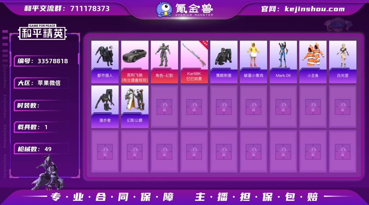 hs66380 苹果微信-1王牌印记-5特效枪-1载具-16461热力值-36套装-49枪皮