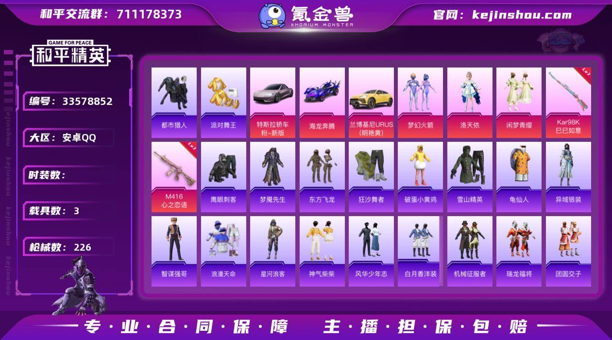 hs69964 安卓手Q-27王牌印记-有战神框-3粉装-6特效枪-3载具-74236热力值-183套装-226枪皮-4卓越印记 【3粉装】角色-洛天依,套装-闲梦青缨,套装-梦幻火箭 【6特效枪】Kar98K-巳巳如意/5级,信号枪-金乌曜日/5级,ACE32-萌骑漫游/3级,Mk14-福马献瑞/5级,M416-心之恋语/7级,DP-28-豹影疾电/5级 【6稀有紫装】都市猎人,派对舞王,浪漫天命,雪山精英,东方飞龙,龟仙人 【3稀有载具】特斯拉Roadster(沁心粉),兰博基尼URUS(明艳黄),海龙奔腾 【182稀有时装】梦幻火箭,洛天依,闲梦青缨,SS38特训,都市猎人,浪漫天命,龟仙人,雪山精英,东方飞龙,派对舞王,狂沙舞者,萌趣咩咩,星河浪客,海上生明月,龙魂突击队,异域银装,白糯汤圆,鱼渊荷华,燕燕于飞,战术大师,智谋强哥,马上有钱,香桃花海,巳巳如意,彩虹兔,琴音绮想,乐音,霓虹热舞,雪绒豹,画境星梦,云鹰凌岚,游乐,云魄琉璃,萌鸡速递,元气之梦,书海巡游,薄荷星砂,云朵鹅,顶瓜瓜,青翼流星,SS35特训,迷域探索者,机械英豪,机械征服者,SS31特训,SS33特训,SS32特训,SS16特训,暴风机械师,时空追击者,SS36特训,花式比心,黑色刀锋,福星高照,夏日音浪,潮流炫酷,SS8特训,众神之王,智慧之神,青玉碎影,SS37特训,特训学院,猎鹰,青年教官,橘黑制服,红色运动,黄色...
