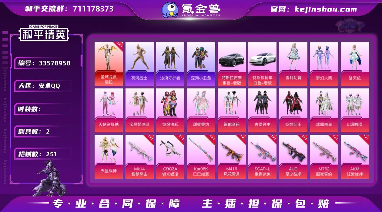 hs69166 安卓手Q-14王牌印记-1红装-13粉装-11特效枪-2载具-87551热力值-173套装-251枪皮-1卓越印记 【1红装】圣域龙灵-瑞拉/3级 【13粉装】套装-缤纷油彩,套装-宝贝奶油派,套装-雪月幻音,套装-智能音符,套装-炙焰红王,套装-天星战神,套装-甜蜜誓约,套装-古堡领主,套装-冰霜白皇,套装-梦幻火箭,套装-山涧鹿灵,角色-洛天依,套装-天使彩虹糖 【11特效枪】DP-28-豹影疾电/5级,GROZA-镜光银凌/5级,Kar98K-巳巳如意/5级,M416-风花雪月/4级,M762-甜蜜誓约/5级,Mk14-甜梦熊击/5级,AUG-星之彼岸/6级,ACE32-萌骑漫游/5级,Mk14-福马献瑞/2级,SCAR-L-童趣迷兔/7级,AKM-炫紫旋律/7级 【10稀有紫装】冥河战士,沙漠守护者,暗影哥特,深海小丑鱼,雪山精英,浪漫波比,迅捷狂鲨,龟仙人,萌熊伴侣背包(3级),真嗣款战斗服 【2稀有载具】特斯拉Model 3(珍珠白),特斯拉Model X(冷光银) 【173稀有时装】瑞拉/3级,梦幻火箭,缤纷油彩,宝贝奶油派,天使彩虹糖,洛天依,智能音符,古堡领主,甜蜜誓约,天星战神,冰霜白皇,炙焰红王,山涧鹿灵,雪月幻音,迅捷龙虾,SS38特训,沙漠守护者,龟仙人,雪山精英,暗影哥特,深海小丑鱼,迅捷狂鲨,浪漫波比,冥河战士,激萌罗小黑,大橘为重,潮萌小黄鸭,萌趣咩咩,神秘黑猫,软萌银虎,海...