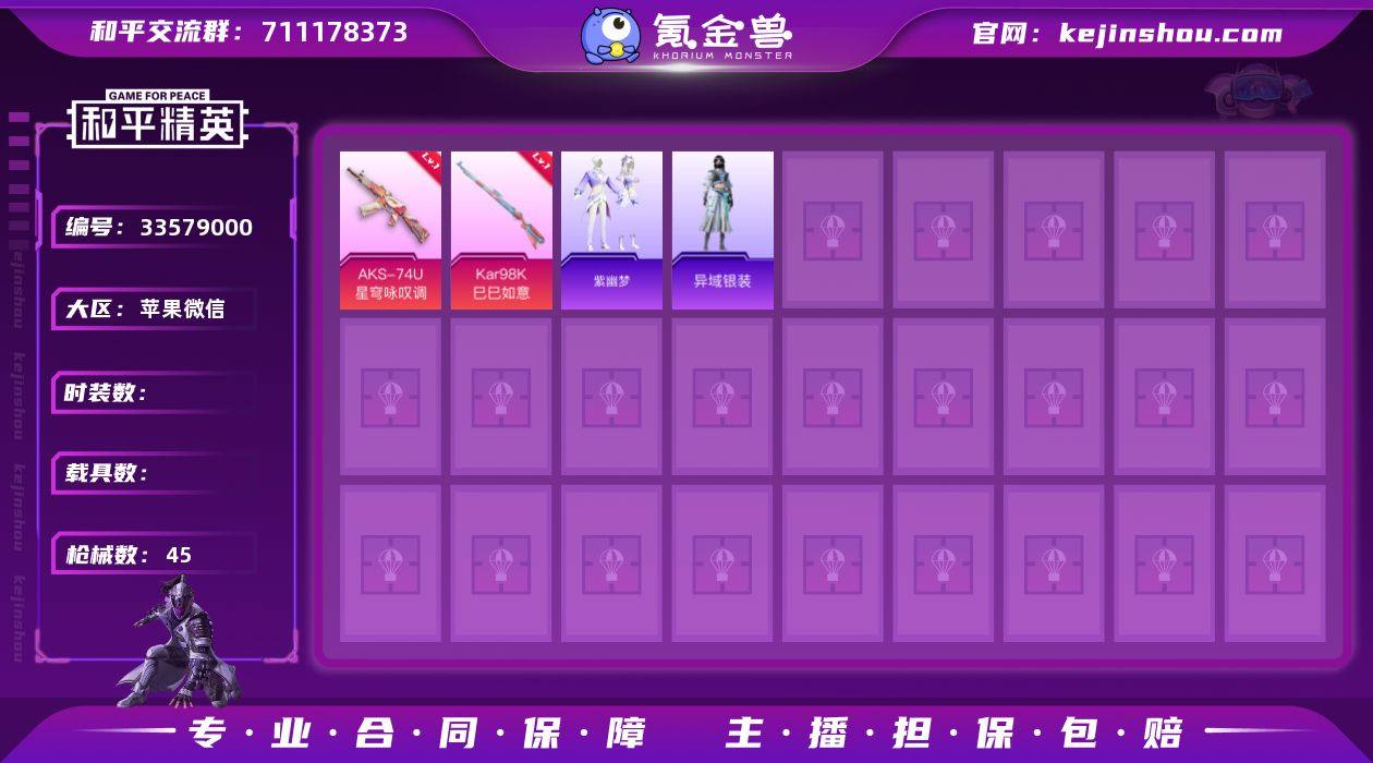 hs52804 苹果微信-0王牌印记-1粉装-2特效枪-12539热力值-26套装-45枪皮 【1粉装】套装-幻彩电音 【2特效枪】AKS-74U-星穹咏叹调/5级,Kar98K-巳巳如意/4级 【26稀有时装】幻彩电音,SS33特训,SS32特训,彩虹兔,蓝冰羽,灵公主,雪绒豹,恋语绒绒,星渊小夜曲,星影赞美诗,SS34特训,紫幽梦,大橘大利,小鸟芋圆,圣穹绘梦,粉恋花,云朵鹅,顶瓜瓜,异域银装,元素星魂,黄色伏地魔,酒红色名流,黄色名流,黑色伏地魔,魅力单车,绮丽涂鸦 【45稀有枪械】AKS-74U-星穹咏叹调/5级,Kar98K-巳巳如意/4级,PKM-紫幽梦,MG3-霓彩脉冲,M16A4-百变魔方,SCAR-L-冷漠罗丽,Mk14-紫幽梦,蜜獾-乌木金纹,M762-云朵鹅,S1897-紫幽梦,SVD-云朵鹅,P92-紫幽梦,M417-玩趣呆呆,G36C-星穹咏叹调,短管霰弹-星穹咏叹调,Kar98K-星穹咏叹调,平底锅-紫幽梦,破片手榴弹-海盐豹豹,UMP45-海盐豹豹,Famas-乌木金纹,SPAS-12-云朵鹅,汤姆逊-智耀战神,沙漠之鹰-云朵鹅,烟雾弹-冰氧夏日,MG3-智耀战神,S686-时光之誓,大砍刀-云朵鹅,SLR-圣穹绘梦,UMP45-圣穹绘梦,沙漠之鹰-圣穹绘梦,平底锅-属我最6,AC-VAL-六号稻草人,蜜獾-鸡智如我,野牛-最终圣卫者,M416-蓝色火焰,M762-彩虹符号,UMP45-生命誓言,S686-彩虹符号,S12K-玩趣呆呆,DBS-彩虹符号,...