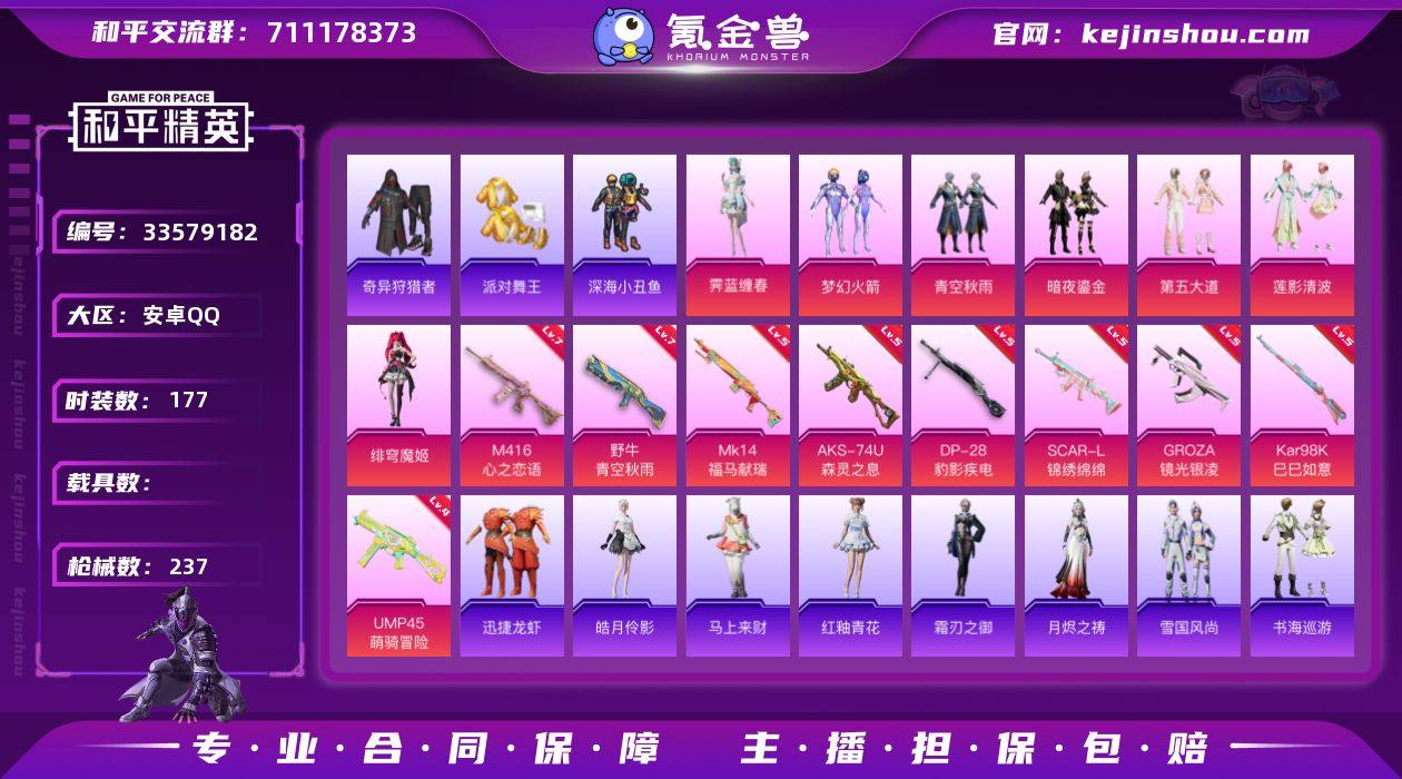DAS11088 包人脸 安卓Q-4稀有7粉装9特效枪9热门177套装237枪皮 74997热力值 8印记 历史卓越王牌6星 奇异狩猎者 浪漫天命 派对舞王 派对舞王(金靴子) 梦幻火箭 鹰眼刺客 【4稀有】 奇异狩猎者 浪漫天命 派对舞王 派对舞王(金靴子) 【7粉装】 梦幻火箭 绯穹魔姬 霁蓝缠春 莲影清波 青空秋雨 第五大道 暗夜鎏金 【9特效枪】 SCAR-L-锦绣绵绵 (5级) M416-心之恋语 (7级) AKS-74U-森灵之息 (5级) Kar98K-巳巳如意 (5级) DP-28-豹影疾电 (5级) GROZA-镜光银凌 (5级) 野牛-青空秋雨 (7级) Mk14-福马献瑞 (5级) UMP45-萌骑冒险 (4级) 【9热门】 龟仙人 鹰眼刺客 迅捷狂鲨 深海小丑鱼 漫步者 韶华初心 破蛋小黄鸡 M762-奇异狩猎者 S686-奇异狩猎者 【1头盔】 梦幻火箭头盔