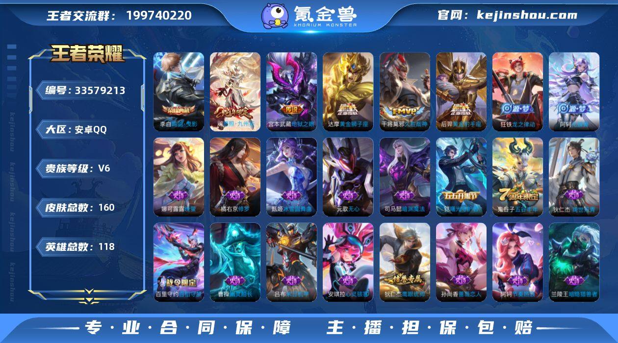安卓QQ/永恒钻石/160皮肤/118英雄/1典藏/0珍品无双/0无双/1珍品传说/7传说/39史诗/7稀有英雄 【1 珍品传说】沧流箭 伽罗, 【1 典藏皮肤】鸣剑·曳影 李白, 【7 传说皮肤】神骥·逐星野 马超,地狱之眼 宫本武藏,黄金射手座 后羿,黄金狮子座 达摩,久胜战神 干将莫邪,愿照·九州拓 澜,神树通天 后羿, 【39 史诗皮肤】末日机甲 吕布,蔬乡物语 鲁班七号,暗渊魔法 司马懿,德古拉伯爵 刘邦,心灵战警 亚瑟,五谷丰年 鬼谷子,无心 元歌,巫礼祀神 少司缘,鬼剑武藏 宫本武藏,百相守梦 黄忠,线条小狗 周瑜,修罗 橘右京,魅力维加斯 妲己,偶像歌手 王昭君,九幽镇关 项羽,晚萤 娜可露露,鹰眼统帅 狄仁杰,金属风暴 墨子,猫狗日记 孙策,魔术师 狄仁杰,龙之律动 狂铁,皇家上将 赵云,涂山容容 公孙离,蔷薇恋人 孙尚香,冰雪圆舞曲 甄姬,节奏热浪 阿轲,曙光守护者 铠,万灵启世 女娲,心灵骇客 安琪拉,箭羽风息 伽罗,乱世虎臣 张飞,百相守梦 周瑜,缤纷独角兽 小乔,百相守梦 百里守约,水果甜心 孙尚香,化蝶舞 阿轲,绮世丹青 狄仁杰,幽灵船长 曹操,暗隐猎兽者 兰陵王, 【85 勇者皮肤】大漠名商 沈梦溪,拳王 达摩,大发明家 达摩,龙舞盛年 沈梦溪,铁甲之心 典韦,沉稳之力 孙尚香,白色死神 白起,黄金武士 典韦,...