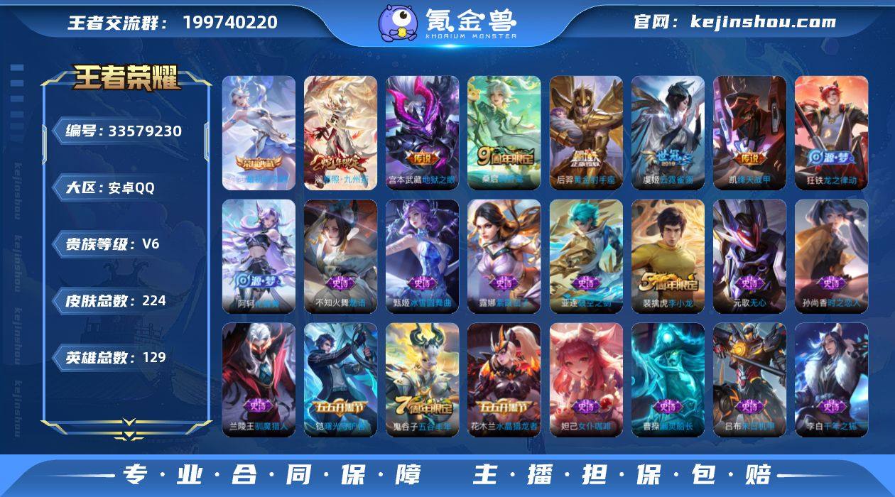 安卓QQ/至尊星耀/224皮肤/129英雄/1典藏/0珍品无双/0无双/0珍品传说/7传说/54史诗/9稀有英雄 【1 典藏皮肤】最初的交响 伽罗, 【7 传说皮肤】云霓雀翎 虞姬,神骥·赴朔漠 狄仁杰,地狱之眼 宫本武藏,黄金射手座 后羿,绛天战甲 铠,愿照·九州拓 澜,鸣野蒿 桑启, 【54 史诗皮肤】末日机甲 吕布,紫霞仙子 露娜,天秀·启明 杨戬,猫狗日记 大乔,五谷丰年 鬼谷子,无心 元歌,鬼剑武藏 宫本武藏,百相守梦 黄忠,瓦猫非猫 太乙真人,线条小狗 周瑜,摇滚巨星 嬴政,黄金分割率 诸葛亮,女仆咖啡 妲己,九幽镇关 项羽,暗夜贵公子 嬴政,鹰眼统帅 狄仁杰,李小龙 裴擒虎,光弋星穹 莱西奥,驯魔猎人 兰陵王,金属风暴 墨子,特工魅影 百里守约,猫狗日记 孙策,逐浪之夏 李元芳,真我赫兹 百里守约,未来纪元 赵云,灵蛊蚀心 扁鹊,魔术师 狄仁杰,龙之律动 狂铁,顽岩魄 蒙犽,皇家上将 赵云,冰冠公主 雅典娜,功夫厨神 程咬金,圣诞恋歌 貂蝉,水晶猎龙者 花木兰,破空之剑 亚连,圣诞狂欢 吕布,魅语 不知火舞,罗小黑战记 百里玄策,夏日便利店 蔡文姬,星界战将 牛魔,茶境仙 孙膑,蔷薇恋人 孙尚香,冰雪圆舞曲 甄姬,千年之狐 李白,曙光守护者 铠,乱世虎臣 张飞,线条小狗 小乔,时之恋人 孙尚香,水果甜心 孙尚香,化蝶舞 阿...