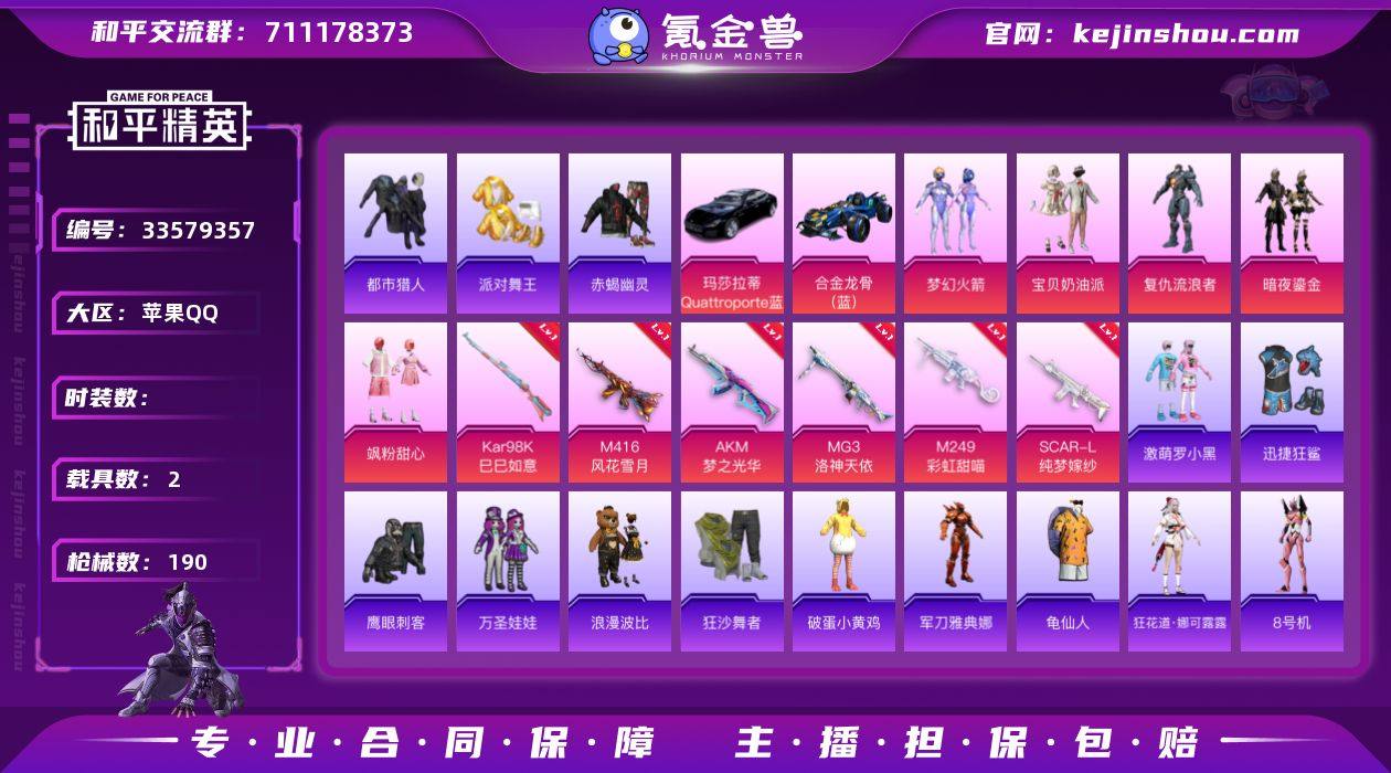hs69689 苹果手Q-13王牌印记-7粉装-10特效枪-2载具-65676热力值-147套装-190枪皮-1卓越印记-1传奇印记 【7粉装】角色-初号机 觉醒Ver.,角色-复仇流浪者,套装-飒粉甜心,角色-异瞳寒姬,套装-梦幻火箭,套装-暗夜鎏金,套装-宝贝奶油派 【10特效枪】SCAR-L-纯梦嫁纱/5级,Mk14-福马献瑞/5级,M249-彩虹甜喵/5级,AKM-梦之光华/7级,Kar98K-巳巳如意/5级,AA12-G-萌骑幻想/2级,MG3-洛神天依/7级,AKS-74U-森灵之息/4级,M416-风花雪月/7级,DP-28-豹影疾电/5级 【11稀有紫装】都市猎人,8号机,派对舞王,赤蝎幽灵,暗影哥特,浪漫天命,浪漫波比,迅捷狂鲨,金羽特工,小丑鱼,龟仙人 【2稀有载具】玛莎拉蒂Quattroporte(夜幕蓝),合金龙骨(蓝) 【147稀有时装】梦幻火箭,初号机 觉醒Ver.,宝贝奶油派,飒粉甜心,复仇流浪者,异瞳寒姬,暗夜鎏金,迅捷龙虾,SS38特训,都市猎人,浪漫天命,龟仙人,暗影哥特,小丑鱼,8号机,金羽特工,迅捷狂鲨,浪漫波比,赤蝎幽灵,派对舞王,激萌罗小黑,狂沙舞者,Alan Walker,萌趣咩咩,狂花道·娜可露露,NV战队服,战术大师,瑰石海星,雏菊兔兔,马上有钱,香桃花海,琴音绮想,画境星梦,元气之梦,书海巡游,薄荷星砂,冰公主,恋语绒绒,SS35特训,SS29特训,萝兰蝴蝶,SS31特训,SS33特训,SS32特...