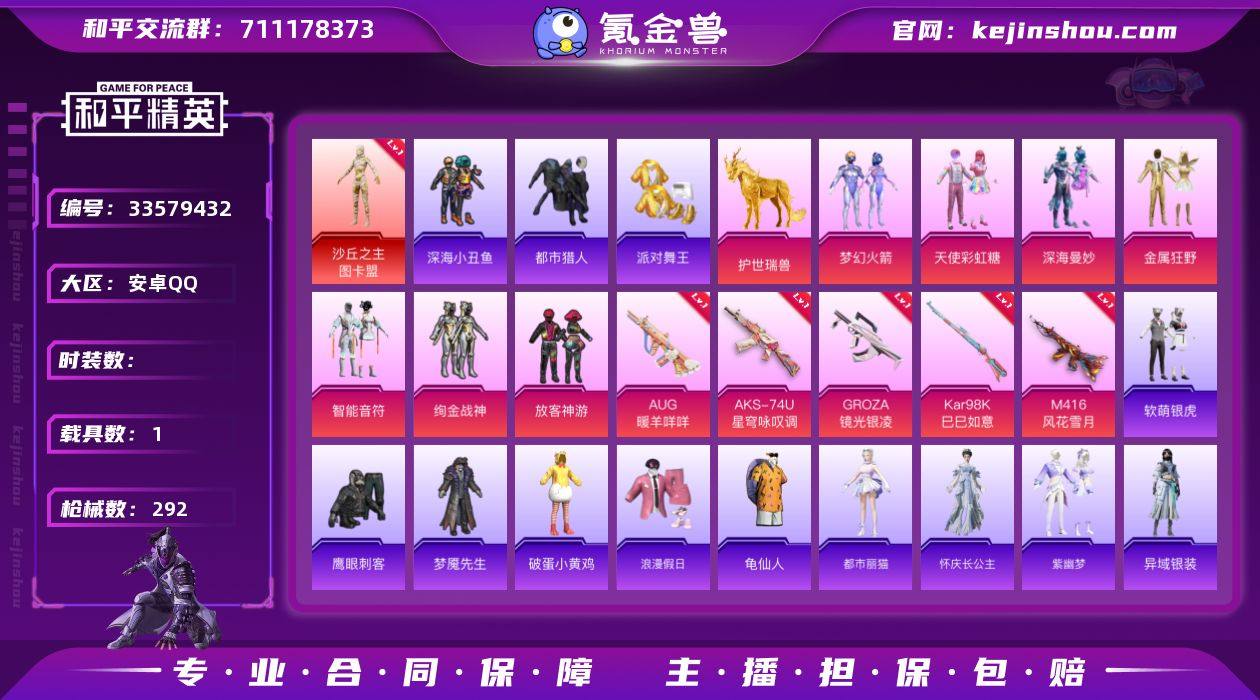 hs68399安卓手Q-11王牌印记-有战神框-1红装-11粉装-15特效枪-1载具-92844热力值-210套装-292枪皮-4卓越印记-3传奇印记 【1红装】沙丘之主-图卡盟/4级 【11粉装】套装-天使彩虹糖,角色-千金淑猫,套装-智能音符,套装-深海曼妙,套装-绚金战神,角色-异瞳寒姬,套装-金属狂野,套装-星穹咏叹调,角色-辉云木星,套装-放客神游,套装-梦幻火箭 【15特效枪】蜜獾-异瞳寒姬/2级,AKS-74U-森灵之息/4级,Mk14-福马献瑞/5级,Kar98K-巳巳如意/5级,M416-风花雪月/7级,平底锅-喜羊羊与灰太狼/2级,GROZA-镜光银凌/5级,破片手榴弹-美味星星糖/6级,MG-36-沧焰双生/5级,AUG-暖羊咩咩/5级,AKS-74U-星穹咏叹调/4级,DP-28-豹影疾电/5级,M416-灵猫魔法师/3级,ACE32-萌骑漫游/2级,12-雪月幻音/3级 【6稀有紫装】都市猎人,派对舞王,深海小丑鱼,金羽特工,龟仙人,怀庆长公主 【1稀有载具】护世瑞兽 【210稀有时装】图卡盟/4级,梦幻火箭,放客神游,天使彩虹糖,智能音符,绚金战神,千金淑猫,辉云木星,深海曼妙,金属狂野,星穹咏叹调,异瞳寒姬,SS38特训,都市猎人,龟仙人,深海小丑鱼,金羽特工,派对舞王,申公豹,萌趣咩咩,软萌银虎,异域银装,都市丽猫,星渊小夜曲,街头风暴,星途旅人,鱼渊荷华,青团波波,大橘大利,燕燕于飞...