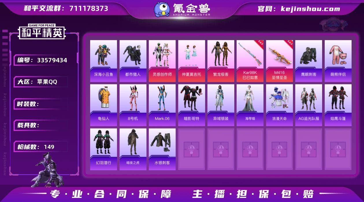 hs68417 苹果手Q-13王牌印记-有战神框-4粉装-6特效枪-44279热力值-93套装-149枪皮-1卓越印记-1传奇印记 【4粉装】套装-灵感创作师,角色-初号机 觉醒Ver.,套装-繁龙极客,套装-仲夏莫吉托 【6特效枪】ACE32-萌骑漫游/5级,Kar98K-巳巳如意/5级,M416-至情至圣/9级,DP-28-豹影疾电/5级,AKS-74U-森灵之息/5级,P90-诸神·破晓/6级 【8稀有紫装】都市猎人,Mark.06,8号机,暗影哥特,深海小丑鱼,浪漫天命,龟仙人,萌熊伴侣背包(3级) 【90稀有时装】初号机 觉醒Ver.,灵感创作师,繁龙极客,仲夏莫吉托,AG追光队服,迅捷龙虾,SS38特训,都市猎人,浪漫天命,龟仙人,Mark.06,暗影哥特,深海小丑鱼,8号机,龙魂突击队,异域银装,白糯汤圆,街头风暴,星途旅人,冰河战士,鱼渊荷华,大橘大利,燕燕于飞,海琴烟,战术大师,香桃花海,蝶变,曼妙人鱼,琴音绮想,极速光影,画境星梦,狂鲨锋刃,粉黛兰香,云魄琉璃,炫彩糖果,萌鸡速递,元气之梦,漫游都市,薄荷星砂,顶瓜瓜,银尘,雪国风尚,恋语绒绒,SS35特训,SS29特训,SS31特训,SS33特训,SS32特训,SS36特训,贝斯之夜,焰鹰斗篷,SS37特训,SS28特训,阳光火鸡,酷潮明星,SS26特训,空岛之星,热情海星,黎明保卫者,纯真浪花,SS34特训,竞技名士,SS30特训,长空猛禽,甜蜜告白,春光漫游,水...