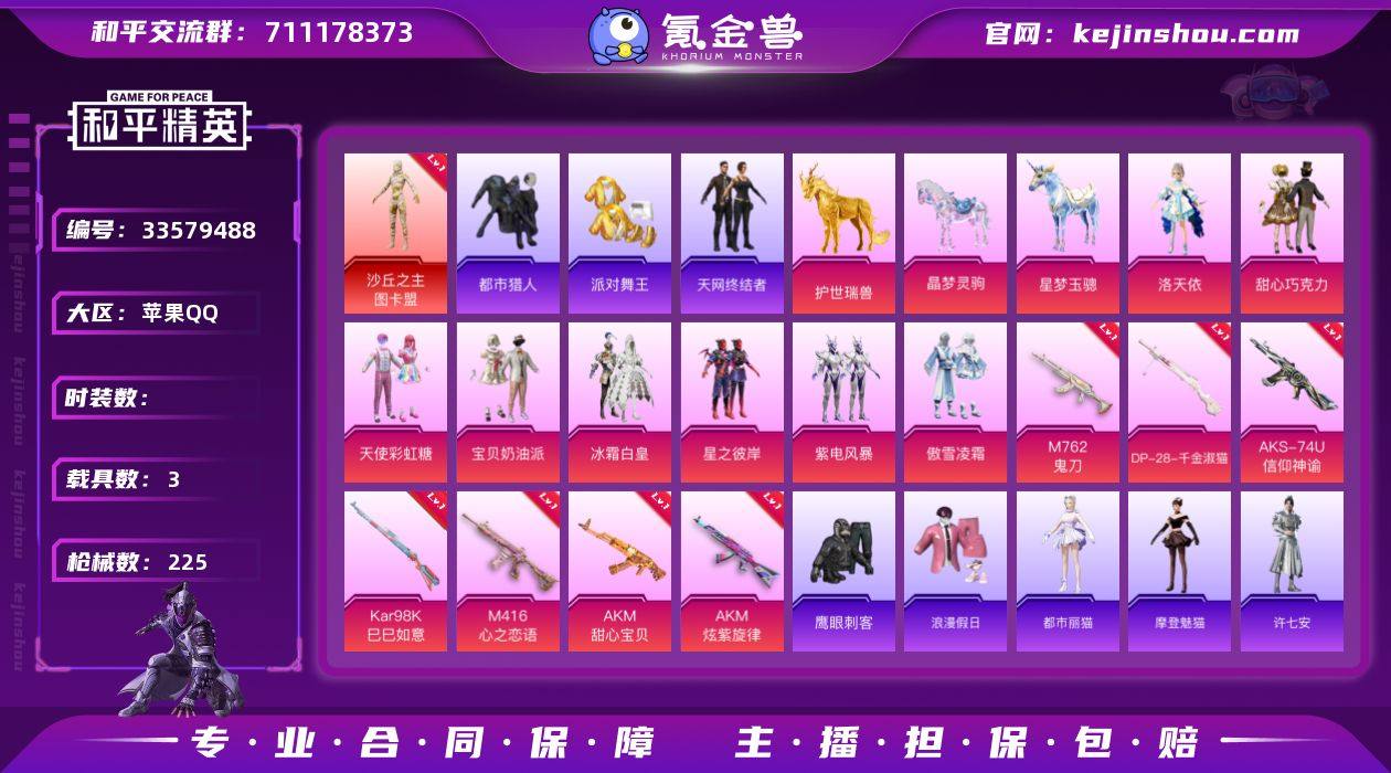 hs68084苹果手Q-13王牌印记-1红装-10粉装-10特效枪-3载具-73718热力值-150套装-225枪皮-2卓越印记-1传奇印记 【1红装】沙丘之主-图卡盟/3级 【10粉装】套装-宝贝奶油派,角色-千金淑猫,套装-紫电风暴,套装-天使彩虹糖,套装-星之彼岸,角色-鸢尾珑雾,套装-甜心巧克力,套装-傲雪凌霜,套装-冰霜白皇,角色-洛天依 【10特效枪】DP-28-豹影疾电/4级,DP-28-千金淑猫/2级,Mk14-福马献瑞/5级,AKS-74U-信仰神谕/7级,M762-鬼刀/4级,Kar98K-巳巳如意/5级,UMP45-萌骑冒险/2级,AKM-炫紫旋律/1级,M416-心之恋语/5级,AKM-甜心宝贝/7级 【7稀有紫装】都市猎人,8号机,派对舞王,天网终结者,浪漫天命,许七安,临安公主 【3稀有载具】护世瑞兽,星梦玉骢,晶梦灵驹 【145稀有时装】图卡盟/3级,甜心巧克力,宝贝奶油派,天使彩虹糖,洛天依,千金淑猫,紫电风暴,傲雪凌霜,冰霜白皇,星之彼岸,迅捷龙虾,SS38特训,都市猎人,浪漫天命,8号机,派对舞王,天网终结者,粉雾星云,粉团憨憨,萌趣咩咩,龙魂突击队,小熊娃娃,异域银装,都市丽猫,摩登魅猫,街头风暴,星途旅人,冰河战士,鱼渊荷华,黑曜寓言,青团波波,燕燕于飞,海琴烟,达芬奇,临安公主,战术大师,紫俏灵猫,许七安,雏菊兔兔,马上有钱,糖糖葫芦,香桃花海,蝶变,巳巳如意,...