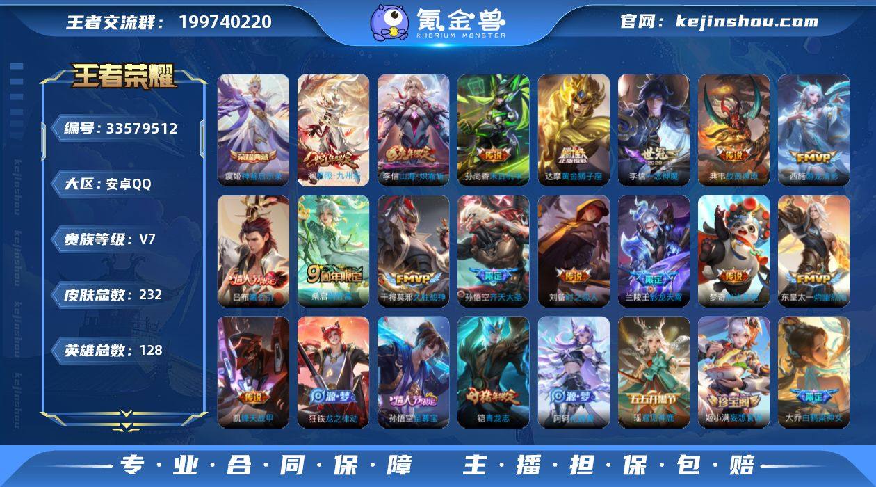 安卓QQ/永恒钻石/232皮肤/128英雄/1典藏/0珍品无双/0无双/1珍品传说/22传说/59史诗/8稀有英雄 【1 珍品传说】沧流箭 伽罗, 【1 典藏皮肤】神鉴启示录 虞姬, 【22 传说皮肤】胖达荣荣 梦奇,罗刹妄海 阿轲,齐天大圣 孙悟空,游龙清影 西施,灼幽烈阳 东皇太一,神骥·赴朔漠 狄仁杰,影龙天霄 兰陵王,神骥·逐星野 马超,神骥·越千峰 云缨,曦玄引 吕布,时之恋人 刘备,黄金狮子座 达摩,久胜战神 干将莫邪,末日机甲 孙尚香,山海·炽霜斩 李信,一念神魔 李信,战鼓燎原 典韦,踏浪归 韩信,绛天战甲 铠,愿照·九州拓 澜,神树通天 后羿,鸣野蒿 桑启, 【59 史诗皮肤】暗渊魔法 司马懿,白鹤梁神女 大乔,苍穹之光 项羽,妄想食味 姬小满,心灵战警 亚瑟,无心 元歌,巫礼祀神 少司缘,鬼剑武藏 宫本武藏,百相守梦 黄忠,线条小狗 周瑜,撼世英歌 盘古,遇见飞天 杨玉环,修罗 橘右京,拒霜思 嫦娥,魅力维加斯 妲己,乐园奇幻夜 钟馗,偶像歌手 王昭君,女仆咖啡 妲己,遇见神鹿 瑶,鹰眼统帅 狄仁杰,胡桃异想国 米莱狄,李小龙 裴擒虎,光弋星穹 莱西奥,春霖将至 上官婉儿,金属风暴 墨子,猫狗日记 孙策,未来纪元 赵云,藏狐·褐绒 老夫子,魔术师 狄仁杰,龙之律动 狂铁,皇家上将 赵云,至尊宝 孙悟空,功夫厨神 程咬金,天...