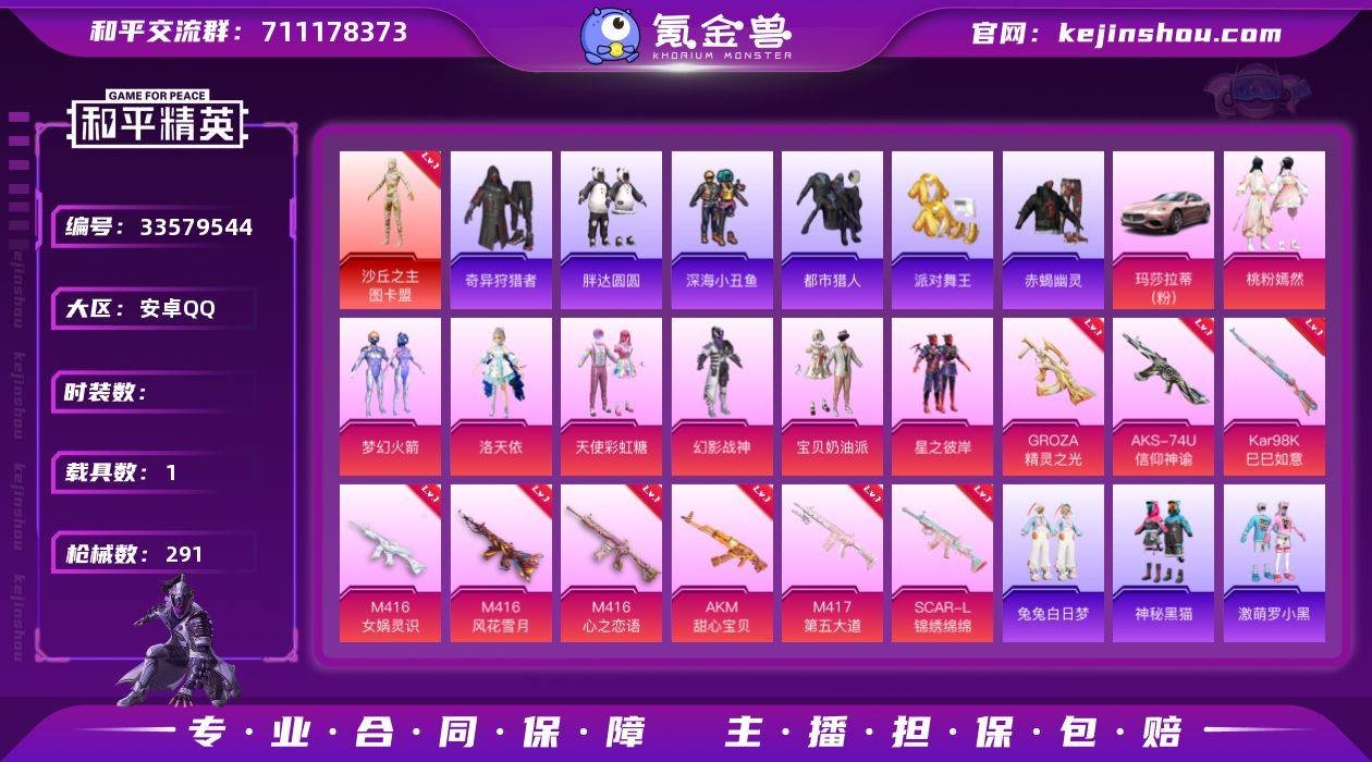 hs69181 安卓手Q-15王牌印记-1红装-7粉装-13特效枪-1载具-94520热力值-221套装-291枪皮-3卓越印记-3传奇印记 【1红装】沙丘之主-图卡盟/2级 【7粉装】角色-洛天依,套装-天使彩虹糖,套装-幻影战神,套装-桃粉嫣然,套装-梦幻火箭,套装-星之彼岸,套装-宝贝奶油派 【13特效枪】AKS-74U-信仰神谕/5级,GROZA-精灵之光/3级,M416-女娲灵识/3级,ACE32-萌骑漫游/2级,M416-风花雪月/6级,Kar98K-巳巳如意/5级,MG-36-沧焰双生/5级,SCAR-L-锦绣绵绵/5级,Mk14-福马献瑞/5级,AKM-甜心宝贝/7级,M416-心之恋语/4级,DP-28-豹影疾电/5级,M417-第五大道/1级 【12稀有紫装】都市猎人,派对舞王,赤蝎幽灵,奇异狩猎者,暗影哥特,深海小丑鱼,浪漫天命,胖达圆圆,迅捷狂鲨,龟仙人,临安公主,萌熊伴侣背包(3级) 【1稀有载具】玛莎拉蒂Ghibli(粉) 【222稀有时装】图卡盟/2级,梦幻火箭,宝贝奶油派,天使彩虹糖,洛天依,幻影战神,桃粉嫣然,创世·幻影,星之彼岸,迅捷龙虾,SS38特训,都市猎人,浪漫天命,奇异狩猎者,龟仙人,暗影哥特,深海小丑鱼,迅捷狂鲨,胖达圆圆,赤蝎幽灵,派对舞王,西部牛仔,激萌罗小黑,大橘为重,兔兔白日梦,狂战萌兔,狂沙舞者,萌熊伴侣,Alan Walker,萌趣咩咩,神秘黑猫,龙魂突击队,异域银装,街头风暴,星...