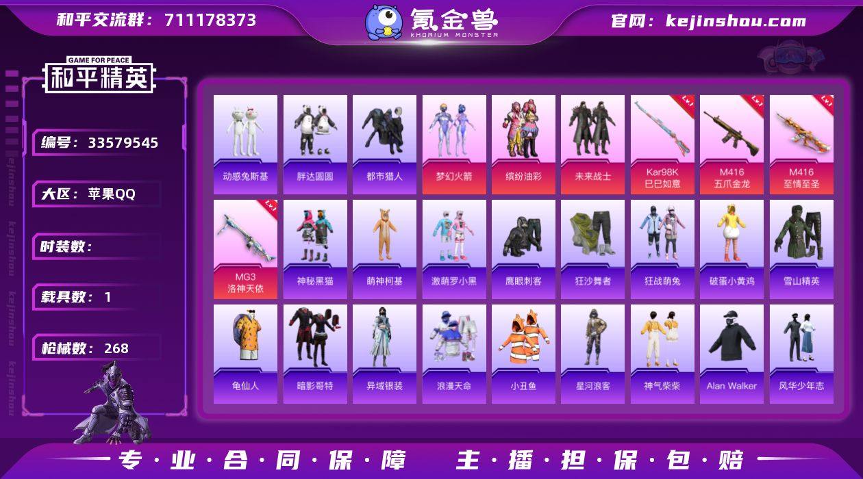 hs69941 苹果手Q-18王牌印记-5粉装-10特效枪-1载具-81092热力值-203套装-268枪皮-5卓越印记-2传奇印记 【5粉装】套装-梦幻火箭,角色-零号机款机体服,角色-鸢尾珑雾,套装-未来战士,套装-缤纷油彩 【10特效枪】AKS-74U-森灵之息/5级,ACE32-百变纱华/3级,DP-28-豹影疾电/5级,Kar98K-巳巳如意/5级,Mk14-福马献瑞/5级,P90-诸神·破晓/4级,M416-五爪金龙/1级,M416-至情至圣/9级,ACE32-萌骑漫游/5级,MG3-洛神天依/4级 【9稀有紫装】都市猎人,暗影哥特,浪漫天命,雪山精英,胖达圆圆,明日香款战斗服,小丑鱼,龟仙人,零款战斗服 【1稀有载具】纱华曳影 【199稀有时装】梦幻火箭,零号机款机体服,缤纷油彩,未来战士,迅捷龙虾,SS38特训,都市猎人,浪漫天命,龟仙人,雪山精英,暗影哥特,小丑鱼,零款战斗服,明日香款战斗服,胖达圆圆,激萌罗小黑,动感兔斯基人偶服,狂战萌兔,狂沙舞者,Alan Walker,萌神柯基,萌趣咩咩,神秘黑猫,星河浪客,海上生明月,异域银装,白糯汤圆,星途旅人,缠丝流银,绿头鱼,战术大师,马上有钱,香桃花海,巳巳如意,月烬之祷,午间小调,风蚀行者,琴音绮想,画境星梦,朱霞炽焰,狂鲨锋刃,凌霄紫焰,擎苍青焰,炫彩糖果,绯色魅影,萌鸡速递,元气之梦,书海巡游,风迹短诗,薄荷星砂,秘语星愿,雪...