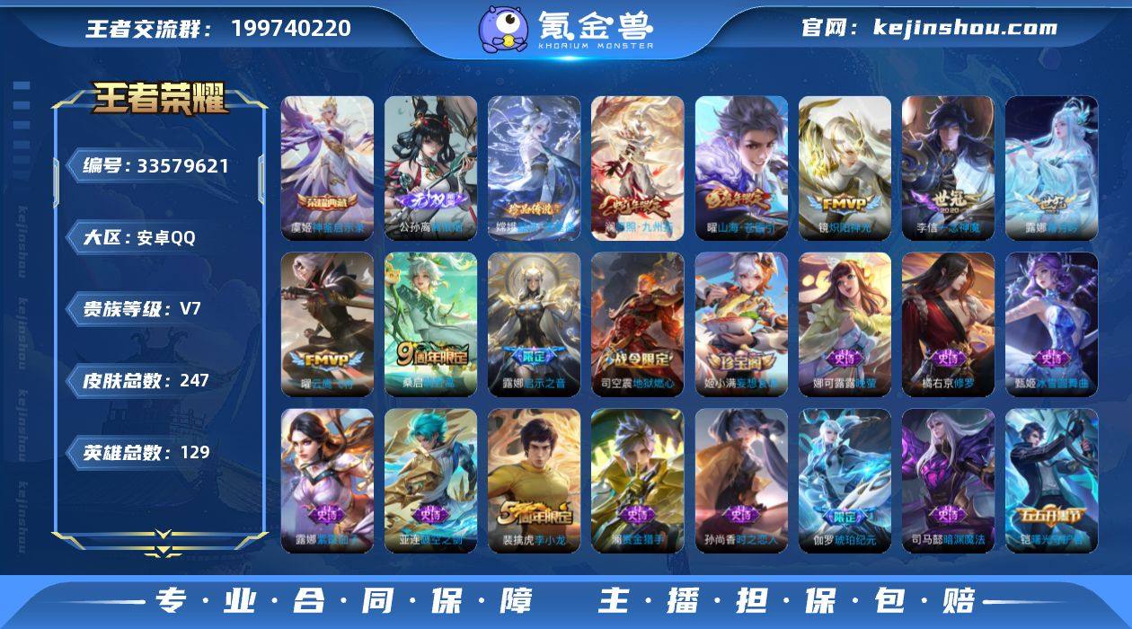 安卓QQ/V7/至尊星耀/247皮肤/129英雄/1典藏/0珍品无双/1无双/1珍品传说/11传说/76史诗/9稀有英雄 【1 珍品传说】器灵·落星盏 嫦娥, 【1 典藏皮肤】神鉴启示录 虞姬, 【1 无双皮肤】离恨烟 公孙离, 【11 传说皮肤】云鹰飞将 曜,神骥·赴朔漠 狄仁杰,炽阳神光 镜,启示之音 露娜,霜月吟 露娜,一念神魔 李信,山海·苍雷引 曜,愿照·九州拓 澜,神树通天 后羿,鸣野蒿 桑启,云诺千山 公孙离, 【76 史诗皮肤】末日机甲 吕布,蔬乡物语 鲁班七号,紫霞仙子 露娜,百解令 蒙犽,暗渊魔法 司马懿,天秀·启明 杨戬,妄想食味 姬小满,五谷丰年 鬼谷子,巫礼祀神 少司缘,鬼剑武藏 宫本武藏,百相守梦 黄忠,迷踪丽影 阿轲,星夜王子 白起,无限星赏官 公孙离,地狱燃心 司空震,线条小狗 周瑜,百晓客 明世隐,摇滚巨星 嬴政,顽趣 梦奇,修罗 橘右京,魅力维加斯 妲己,黄金分割率 诸葛亮,偶像歌手 王昭君,荣光圣徽 蒙恬,女仆咖啡 妲己,赏金猎手 澜,九幽镇关 项羽,星界游侠 暃,晚萤 娜可露露,鹰眼统帅 狄仁杰,末日机甲 莱西奥,玫瑰异探 镜,李小龙 裴擒虎,光弋星穹 莱西奥,春霖将至 上官婉儿,纤云弄巧 云中君,龙骑士 墨子,金属风暴 墨子,匿光侦查者 李元芳,特工魅影 百里守约,猫狗日记 孙策,原初追逐者 百里玄策,逐...