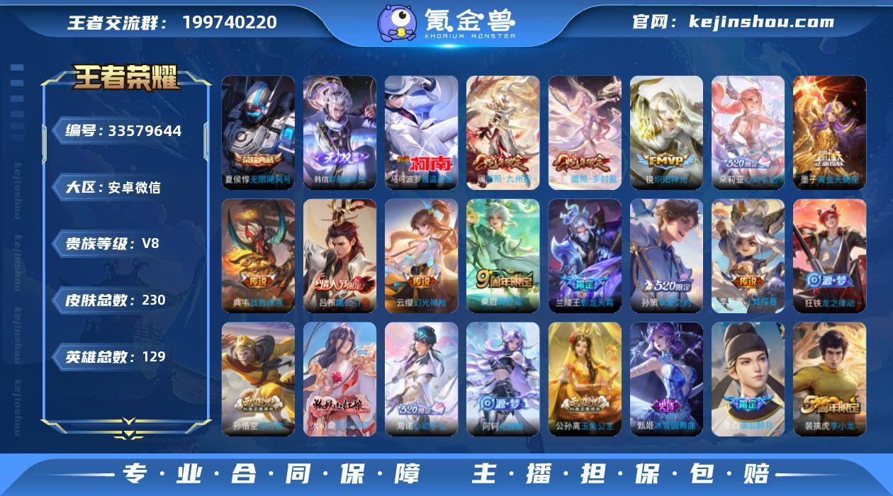 安卓微信/至尊星耀/230皮肤/129英雄/1典藏/0珍品无双/1无双/1珍品传说/16传说/74史诗/9稀有英雄 【1 珍品传说】怪盗基德 马可波罗, 【1 典藏皮肤】无限飓风号 夏侯惇, 【1 无双皮肤】群星魔术团 韩信, 【16 传说皮肤】启明星使 虞姬,飞鸢探春 李元芳,九山相柳 司马懿,影龙天霄 兰陵王,炽阳神光 镜,曦玄引 吕布,挚爱之约 孙策,战鼓燎原 典韦,千山共赴 干将莫邪,心动手记 朵莉亚,愿照·九州拓 澜,黄金天蝎座 墨子,神树通天 后羿,幻光神枪 云缨,愿照·岁时盈 虞姬,鸣野蒿 桑启, 【74 史诗皮肤】时之奇旅 安琪拉,末日机甲 吕布,蔬乡物语 鲁班七号,暗渊魔法 司马懿,苍穹之光 项羽,天秀·启明 杨戬,德古拉伯爵 刘邦,心灵战警 亚瑟,五谷丰年 鬼谷子,无心 元歌,戍鼓铭心 钟无艳,巫礼祀神 少司缘,鬼剑武藏 宫本武藏,百相守梦 黄忠,星夜王子 白起,瓦猫非猫 太乙真人,线条小狗 周瑜,玉兔公主 公孙离,摇滚巨星 嬴政,顽趣 梦奇,魅力维加斯 妲己,黄金分割率 诸葛亮,乐园奇幻夜 钟馗,偶像歌手 王昭君,完美假期 米莱狄,荣光圣徽 蒙恬,女仆咖啡 妲己,赏金猎手 澜,九幽镇关 项羽,舞动绿茵 蔡文姬,鹰眼统帅 狄仁杰,孙行者 孙悟空,傩神司 兰陵王,李小龙 裴擒虎,光弋星穹 莱西奥,纤云弄巧 云中君,原初...