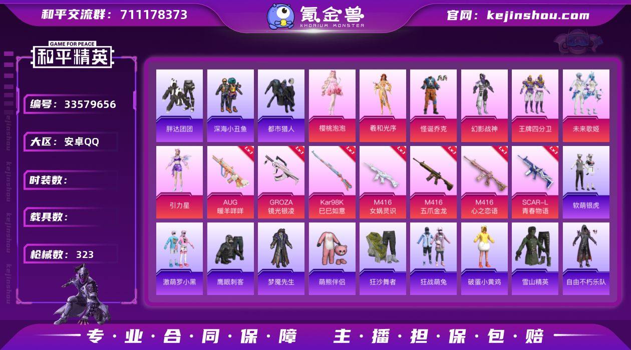 hs68951 安卓手Q-27王牌印记-有战神框-7粉装-10特效枪-97970热力值-247套装-323枪皮-1卓越印记-1传奇印记 【7粉装】套装-王牌四分卫,套装-幻影战神,角色-引力星,套装-怪诞乔克,角色-樱桃泡泡,角色-羲和光序,套装-未来歌姬 【10特效枪】M416-五爪金龙/3级,DP-28-豹影疾电/5级,SCAR-L-青春物语/7级,Mk14-福马献瑞/5级,AUG-暖羊咩咩/5级,M416-女娲灵识/3级,Kar98K-巳巳如意/5级,M416-心之恋语/7级,ACE32-萌骑漫游/3级,GROZA-镜光银凌/5级 【9稀有紫装】都市猎人,暗影哥特,深海小丑鱼,浪漫天命,雪山精英,胖达团团,小丑鱼,龟仙人,萌熊伴侣背包(3级) 【247稀有时装】怪诞乔克,樱桃泡泡,幻影战神,王牌四分卫,羲和光序,未来歌姬,引力星,迅捷龙虾,都市猎人,胖达团团,浪漫天命,龟仙人,雪山精英,暗影哥特,深海小丑鱼,小丑鱼,激萌罗小黑,狂战萌兔,狂沙舞者,萌趣咩咩,软萌银虎,海上生明月,龙魂突击队,异域银装,摩登魅猫,星渊小夜曲,街头风暴,冰河战士,鱼渊荷华,青团波波,大橘大利,燕燕于飞,战术大师,智谋强哥,马上有钱,糖糖葫芦,旋风灵鼠,巳巳如意,粉恋花,棉花软糖,朱霞炽焰,美羊羊,凌霄紫焰,擎苍青焰,炫彩糖果,萌鸡速递,元气之梦,薄荷星砂,顶瓜瓜,雪国风尚,蓝冰羽,恋语绒绒,紫幽梦,SS35特...
