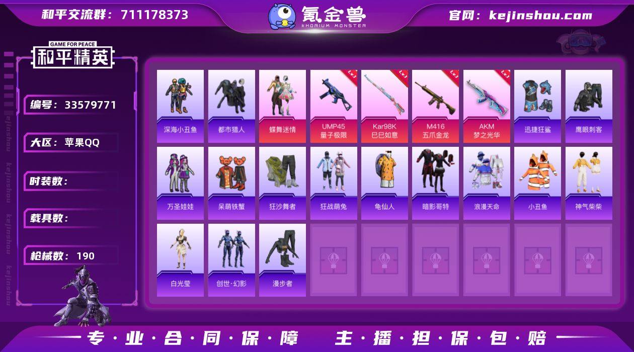 hs69954 苹果手Q-8王牌印记-3粉装-11特效枪-56951热力值-133套装-190枪皮-1卓越印记 【3粉装】人物-小舞·灵珑,套装-蝶舞迷情,角色-罪夜之冕 【11特效枪】AUG-罪夜之冕/6级,Mk14-福马献瑞/5级,MP7-G-水中影/4级,ACE32-萌骑漫游/1级,AA12-G-萌骑幻想/1级,AKS-74U-森灵之息/5级,M416-五爪金龙/6级,Kar98K-巳巳如意/4级,AKM-梦之光华/5级,DP-28-豹影疾电/5级,UMP45-量子极限/5级 【7稀有紫装】都市猎人,暗影哥特,深海小丑鱼,浪漫天命,迅捷狂鲨,小丑鱼,龟仙人 【128稀有时装】蝶舞迷情,小舞·灵珑,罪夜之冕,迅捷龙虾,SS38特训,都市猎人,浪漫天命,龟仙人,暗影哥特,深海小丑鱼,小丑鱼,迅捷狂鲨,狂战萌兔,狂沙舞者,萌趣咩咩,龙魂突击队,霜刃之御,白糯汤圆,创世·幻影,星途旅人,冰河战士,AG战队服,战术大师,马上有钱,蝶变,元素星魂,月烬之祷,琴音绮想,画境星梦,游乐,懒羊羊,书海巡游,薄荷星砂,白光莹,青翼流星,SS35特训,SS29特训,SS31特训,SS33特训,SS32特训,暴风机械师,明鸳圣池,SS36特训,幽秘魅影,龙的传人,潮流炫酷,白熊同盟,SS37特训,SS28特训,特训学院,猎鹰,青年教官,红色运动,黄色运动,蓝色运动,黄色伏地魔,白色伏地魔,热血青春,活力之心,SS9特训,阳光火鸡,湖蓝色名流,黄色名流,酷...