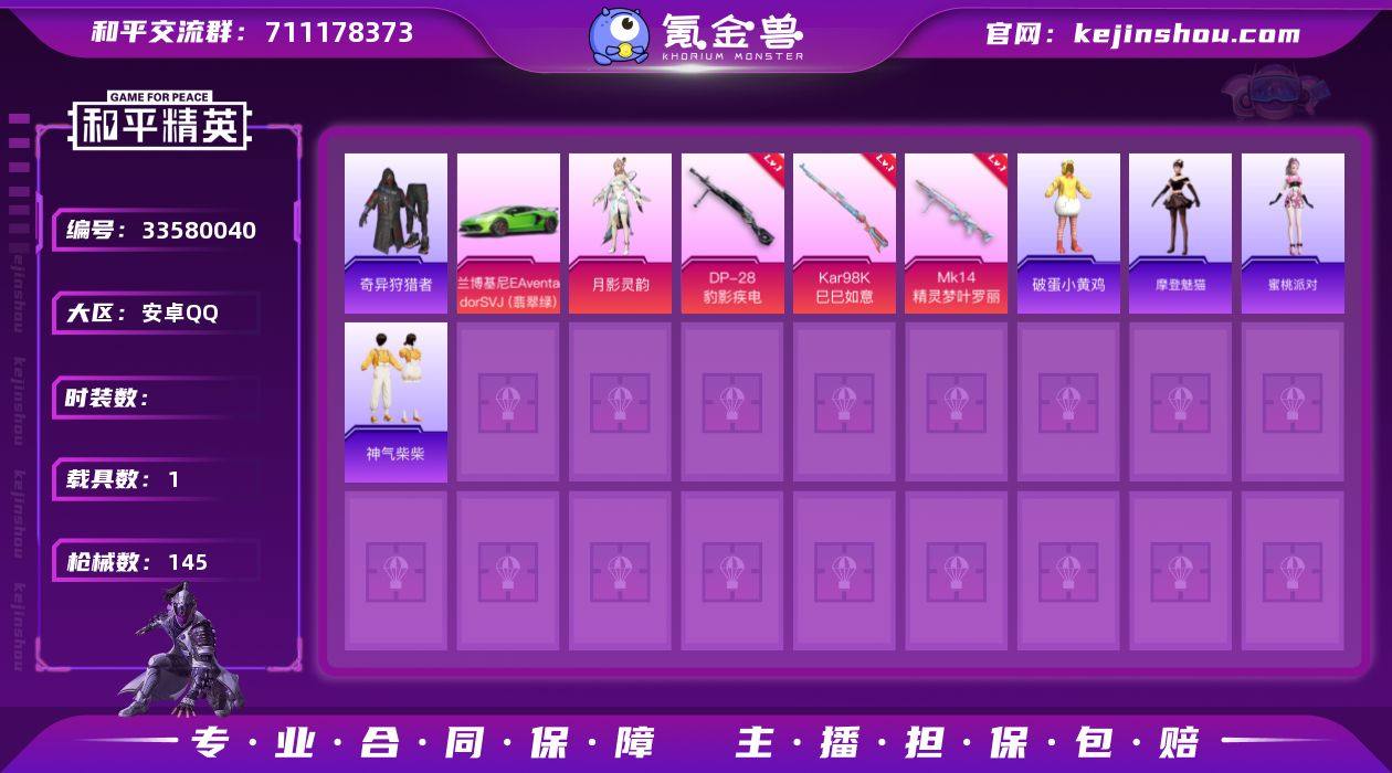 精品小号【特价出售/店主推荐--热门套装奇异狩猎者/1把七级枪/载具兰博基尼】安卓 手Q-2粉装-5特效枪-1载具-1粉色飞行器-39848热力值-2王牌印记-98套装-145枪皮【热门品类】:套装-奇异狩猎者【粉色套装】:角色-月影灵韵,角色-霁蓝缠春【粉色枪皮等级】:ACE32-萌骑漫游(五级),Kar98K-巳巳如意(五级),Mk14-精灵梦叶罗丽(七级),Mk14-福马献瑞(一级),DP-28-豹影疾电(五级)【粉色载具】:兰博基尼Aventador SVJ(翡翠绿)【粉色枪皮】:ACE32-萌骑漫游,Kar98K-巳巳如意,Mk14-精灵梦叶罗丽,Mk14-福马献瑞,DP-28-豹影疾电【粉色飞行器】:炫彩糖果飞行器