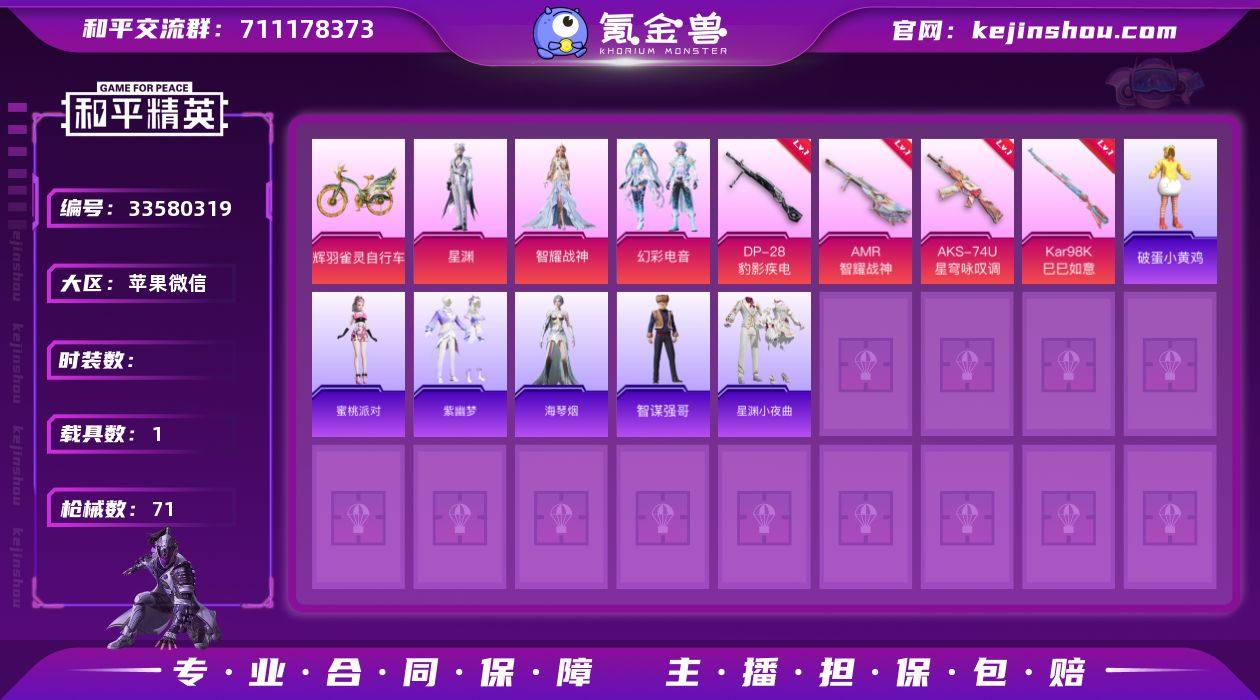 M1046122【特价出售 4粉装-5特效枪辉羽雀灵自行车】苹果V 5王牌印记-4粉装-5特效枪-71枪皮-51套装-1载具 【1载具】 辉羽雀灵自行车 【4粉装】 异瞳寒姬 绝对恒星 幻彩电音 智耀战神 【5特效枪】 AKS-74U-星穹咏叹调 DP-28-豹影疾电 Kar98K-巳巳如意 M249-绝对恒星 AMR-智耀战神 【8飞行器】 时光之吻飞行器 雀灵庇佑飞行器 炫彩糖果飞行器 破刃行动尾迹 绝对恒星飞行器 狂鲨锋刃飞行器 登顶巅峰飞行器 异域银装飞行器 【16头盔】 星穹咏叹调头盔(3级) 粉黛兰香头盔(3级) 临安公主头盔(3级) 炫彩糖果头盔(3级) 御兔特攻头盔(3级) 辉羽雀灵头盔(3级) 月影灵韵头盔(3级) 绝对恒星头盔(3级) 狂鲨锋刃头盔(3级) 紫幽梦头盔(3级) 幻彩电音头盔(3级) 画境星梦头盔(3级) 雪国风尚头盔(3级) 智耀战神头盔(3级) 鬼刀头盔(3级) 樱桃泡泡头盔(3级) 【57背包】 智谋强哥背包(3级) 雪国风尚背包(1级) 罪夜之冕背包(2级) 巳巳如意背包(3级) 雪国风尚背包(2级) 动力核心背包(2级) 星穹咏叹调背包(3级) 星穹咏叹调背包(2级) 星穹咏叹调背包(1级) 粉黛兰香背包(1级) 临安公主背包(3级) 粉黛兰香背包(2级) 雪月幻音背包(3级) 甜蜜菠萝背包(1级) 炫彩糖果背包(1级) 炫彩糖果背包(3级) 辉羽雀灵背...