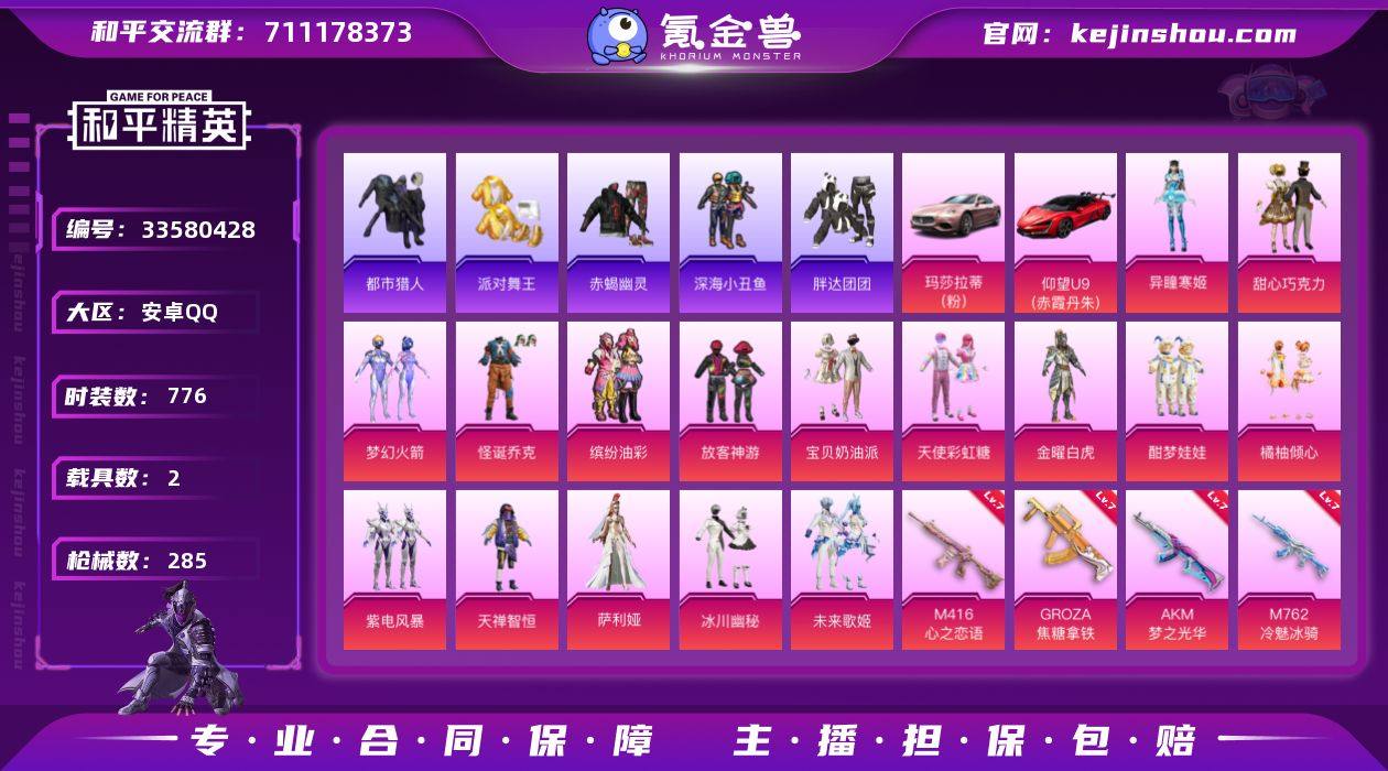 【特价出售】安卓Q-7稀有2载具16粉装8特效枪27热门207套装285枪皮 94783热力值 14印记 历史卓越王牌16星 【7稀有】 赤蝎幽灵 AKM-缤纷海域 SCAR-L-粉色回忆 都市猎人 浪漫天命 派对舞王 派对舞王(金靴子) 【2载具】 仰望U9(赤霞丹朱) 玛莎拉蒂粉色 【16粉装】 梦幻火箭 萨利娅 宝贝奶油派 天使彩虹糖 甜心巧克力 异瞳寒姬 未来歌姬 金曜白虎 怪诞乔克 酣梦娃娃 缤纷油彩 放客神游 橘柚倾心 天禅智恒 冰川幽秘 紫电风暴 【8特效枪】 M416-心之恋语 (7级) AKS-74U-森灵之息 (5级) Kar98K-巳巳如意 (5级) DP-28-豹影疾电 (5级) AKM-梦之光华 (7级) M762-冷魅冰骑 (7级) Mk14-福马献瑞 (5级) GROZA-焦糖拿铁 (7级) 【27热门】 小丑鱼 红熊茄茄 动感兔斯基 潮萌小黄鸭 软软马卡龙 糯粉咩咩 呆萌铁蟹 鹰眼刺客 激萌罗小黑 迅捷狂鲨 深海小丑鱼 胖达团团 AG战队服 TT战队服 暗影哥特 粉红小猪 狂沙舞者 漫步者 冰爽海盐 娴静芝兰 破蛋小黄鸡 极速红龙 弄潮海豚 M24-奇异狩猎者 M249-古堡领主 S686-奇异狩猎者 AWM-激战未来 【4飞行器】 相思残雪飞行器 镜光幻境飞行翼 太空嘟嘟飞行器 庄周梦蝶飞行器 【4头盔】 梦幻火箭头盔 甜心宝贝头盔 深海小丑鱼头盔 夏日绵绵冰头盔 【4背包】...