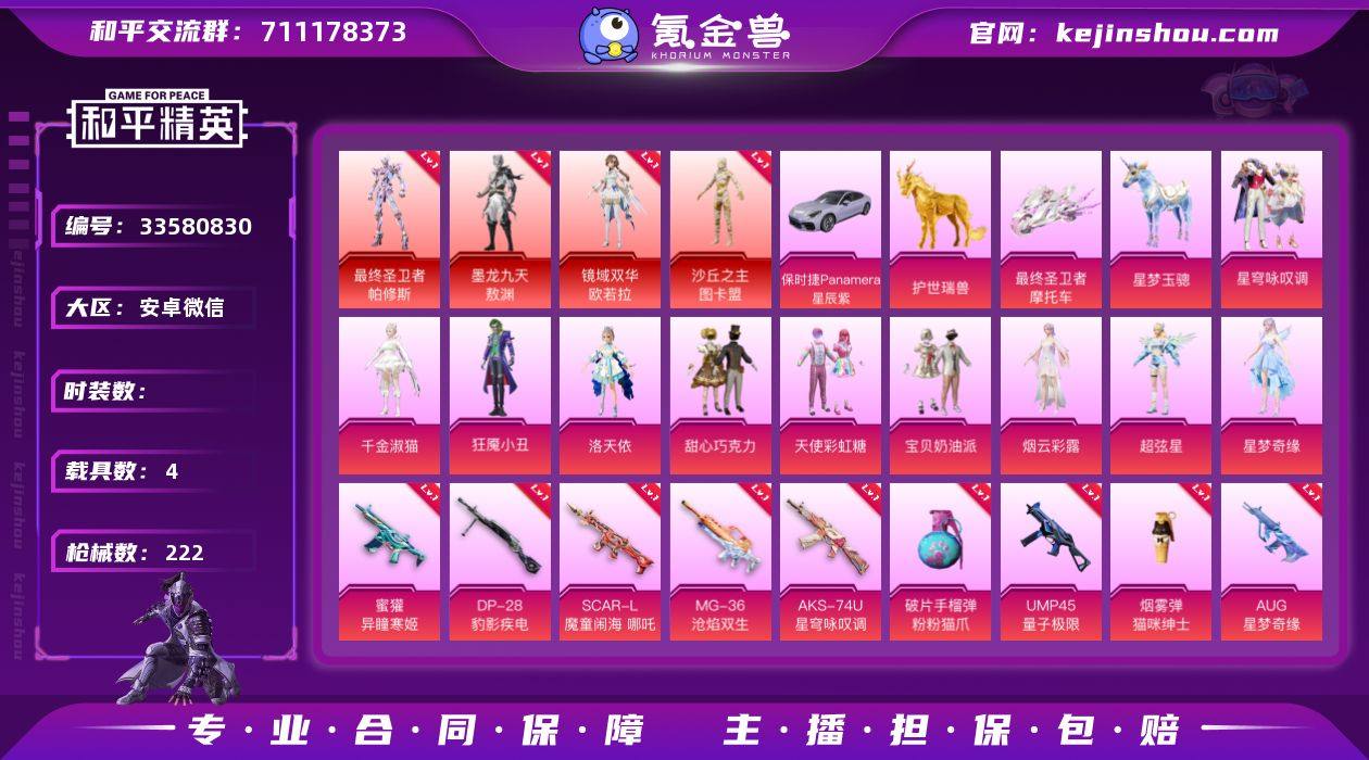 【氪金男神号!战神框 4红装 6级红 图卡盟 欧若拉 敖渊 帕修斯 巧克力三姐妹 8级星梦奇缘 8级墨龙九天 7把计数枪】c25544-【无二次】【因赛季更新游戏段付以上号为准!】 安卓V-4红装4载具11粉装25特效枪3热门114套装222枪皮 11印记 历史无敌战神 【4红装】 最终圣卫者-帕修斯 (1级) 墨龙九天-敖渊 (1级) 镜域双华-欧若拉 (1级) 沙丘之主-图卡盟 (6级) 【4载具】 保时捷Panamera(星辰紫) 护世瑞兽 星梦玉骢 最终圣卫者摩托车 【11粉装】 超弦星 宝贝奶油派 天使彩虹糖 甜心巧克力 狂魇小丑 千金淑猫 洛天依 异瞳寒姬 烟云彩露 星穹咏叹调 星梦奇缘 【29特效枪】 SCAR-L-魔童闹海哪吒 (3级) M416-墨龙九天 (8级) M416-电玩时刻 (5级) P90-电糖天使 (1级) P90-沙丘之主 (3级) AKM-甜心宝贝 (4级) AKS-74U-星穹咏叹调 (4级) Kar98K-巳巳如意 (5级) Vector-最终圣卫者 (3级) M762-电糖天使 (3级) MG-36-沧焰双生 (5级) DP-28-豹影疾电 (5级) AUG-星梦奇缘 (8级) PKM-江南烟雨 (3级) 蜜獾-异瞳寒姬 (1级) UMP45-量子极限 (5级) Mk14-精灵梦叶罗丽 (1级) Mk14-爆裂游戏 (7级) AMR-鸢尾晶梦 (7级) GROZA-巴啦啦小魔仙 (4级) M416-至情至圣 (1级) M417-第五大道 (1级) MG3-洛神天...