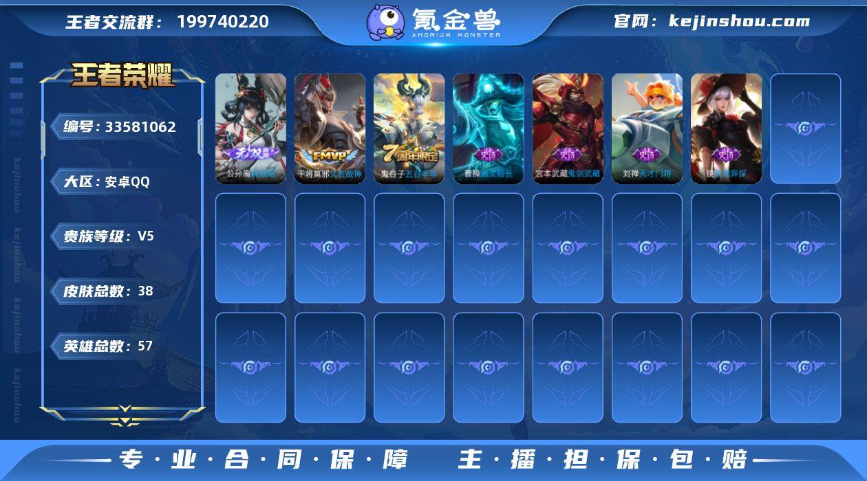 2557048-0【秒换绑,无需等三天】V5-38皮肤 1印记【女号】安卓Q-V-38皮肤1典藏1无双1珍品传说2传说 【典藏】 颠倒童话魔镜 【无双】 离恨烟 【珍品传说】 沧流箭 【传说】 神骥聚万邦 久胜战神 【热门】百晓客 玫瑰异探 幽灵船长 天才门将 鬼剑武藏 金庭之子 大漠名商 云中旅人 丁香结 皇家上将 魅力维加斯 天穹祈灯 五谷丰年 鹰眼统帅 57英雄-营地ID:1526039328