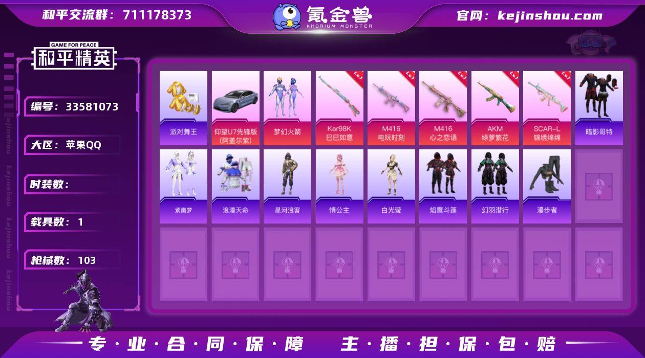 DYH18146【身法号1载具-2粉装-7特效枪梦幻火箭,角色-荧海星豚 JTeam战队服,浪漫天命,暗影哥特,派对舞王 心之恋语[7级]】无二次包苹果手Q-1载具-2粉装-7特效枪-71套装-103枪皮-7王牌印记-荣耀皇冠Ⅲ-32066热力值【1载具】仰望U7(阿盖尔紫)【2粉装】梦幻火箭,角色-荧海星豚【7特效枪】Mk14-福马献瑞[1级],DP-28-豹影疾电[4级],Kar98K-巳巳如意[5级],AKM-绿萝繁花[5级],M416-心之恋语[7级],M416-电玩时刻[5级],SCAR-L-锦绣绵绵[5级]【4稀有】JTeam战队服,浪漫天命,暗影哥特,派对舞王【1飞行器】炫彩糖果飞行器【1头盔】梦幻火箭头盔【1背包】梦幻火箭背包【161其它衣服和枪皮】SS28特训,快闪甜心,薄荷星砂,元气之梦,红釉青花,都市漫游者,SS37特训,热情海星,竞技名士,纯真浪花,幻羽潜行,SS33特训,狙击之神,惊鸿侠骨,夏日倾情,蓝冰羽,云霞荷露,黄色运动,白熊同盟,SS27特训,SS34特训,特训学院,锦衣飞扬,燕燕于飞,沙丘之歌,缤纷果语,SS32特训,雨过天青,白色伏地魔,竞技角斗士,冰冻风暴,空岛之星,SS26特训,鱼渊荷华,焰鹰斗篷,青玉碎影,雨林探路者,春光漫游,青年教官,霓虹街区,极地朋克,红色运动,SS31特训,海盐绵绵冰,漫步者,魅力单车,SS35特训,鹤鸣,SS25特训,燕雀桃枝,角色-猎影月神,角...