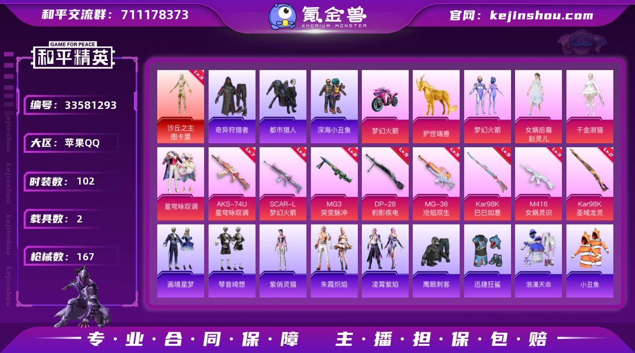 苹果 手Q-1神装-5粉装-11特效枪-2载具-9粉色飞行器-56715热力值-10王牌印记-102套装-167枪皮 【红色神装等级】:沙丘之主-图卡盟(三级) 【红色角色神装】:沙丘之主-图卡盟 【热门品类】:粉装-梦幻火箭,套装-浪漫天命,套装-都市猎人,套装-深海小丑鱼,套装-小丑鱼,套装-奇异狩猎者,套装-AG战队服,角色-Mark.06 【粉色套装】:粉装-梦幻火箭,女娲后裔-赵灵儿,角色-千金淑猫,粉装-星穹咏叹调,人物-小舞·雪昙 【粉色枪皮等级】:SCAR-L-梦幻火箭(六级),M416-女娲灵识(三级),ACE32-萌骑漫游(四级),UMP45-萌骑冒险(五级),AKS-74U-星穹咏叹调(七级),Kar98K-巳巳如意(五级),Kar98K-圣域龙灵(二级),Mk14-福马献瑞(五级),DP-28-豹影疾电(五级),MG3-突变脉冲(六级),MG-36-沧焰双生(五级) 【粉色载具】:双人摩托-梦幻火箭,护世瑞兽 【粉色枪皮】:SCAR-L-梦幻火箭,M416-女娲灵识,ACE32-萌骑漫游,UMP45-萌骑冒险,AKS-74U-星穹咏叹调,Kar98K-巳巳如意,Kar98K-圣域龙灵,Mk14-福马献瑞,DP-28-豹影疾电,MG3-突变脉冲,MG-36-沧焰双生 【粉色飞行器】:酣梦熊熊飞行器,炫彩糖果飞行器,祥瑞起舞飞行器,镜域双华-灵镜之阶,龙翔九天飞行器,深渊漩涡飞行器,...