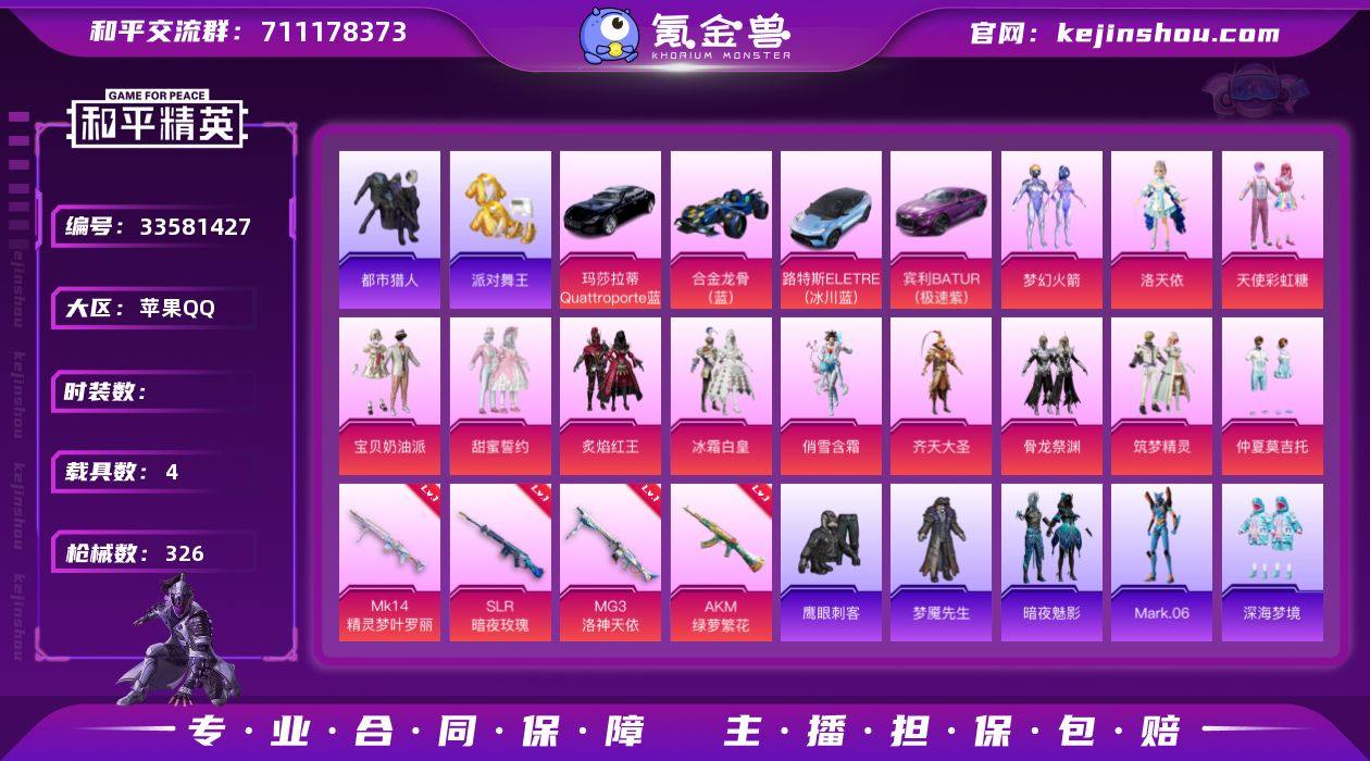 [17916509]15粉装 10特效枪 4.0载具 19印记 可二次 【热门装扮】都市猎人,鹰眼刺客,派对舞王(小金鞋),梦魇先生,宝贝奶油派,天使彩虹糖,梦幻火箭(新101) ,甜蜜誓约,冰霜白皇,炙焰红王,洛天依,齐天大圣,骨龙祭渊,暗夜魅影,筑梦精灵,俏雪含霜,烟云彩露,狂花道·不知火舞,绯穹魔姬,仲夏莫吉托 【载具】宾利BATUR(极速紫),玛莎拉蒂Quattroporte(夜幕蓝),路特斯ELETRE(冰川蓝),合金龙骨(蓝) 【稀有枪皮】蜜獾-异瞳寒姬,AKM绿萝繁花,ACE32-萌骑漫游,Kar98K-巳巳如意,Mk14精灵梦叶罗丽,14-福马献瑞,SLR暗夜玫瑰,MG3洛神天依,DP-28-豹影疾电,爆炸猎弓-拳皇·狂花道 【七级特效枪】七级Mk14-精灵梦叶罗丽,七级SLR-暗夜玫瑰,七级MG3-洛神天依,七级爆炸猎弓-拳皇·狂花道 【六级特效枪】六级蜜獾-异瞳寒姬 【五级特效枪】五级AKM-绿萝繁花,五级Kar98K-巳巳如意,五级14-福马献瑞,五级DP-28-豹影疾电 【四级特效枪】四级ACE32-萌骑漫游 【紫色装扮】猎鹰,青年教官,橘黑制服,红色运动,黄色运动,蓝色运动,黄色伏地魔,白色伏地魔,黑色伏地魔,冰川格斗者,竞技名士,酒红色名流,湖蓝色名流,黄色名流,猛禽,长空猛禽,漫步者,海岛探路者,旭日情侣,冷焰舞者,灼焰舞者,浪漫天命,特战装甲,战地督...