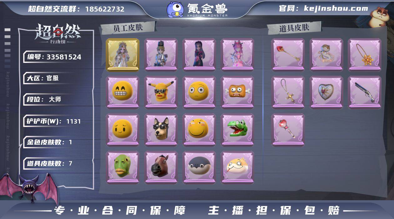 金色皮肤数量: 1 紫色皮肤数量: 3 道具皮肤数量: 7 段位: 大师 外观: 圣光之谕,王子与骑士,丝缕哀歌,情公主,嘻嘻头套,烈焰红唇头套,呆滞头套,炙热烧烤,卑微头套,哈士奇头套,滑稽头套,鳄霸天头套,鱼头怪头套,面具马头套,萨卡班甲鱼头套,小狗蛇点点头套,毛球夹子,天使的呼唤,天使消失的年代