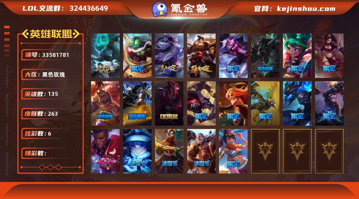 t38321【黑色玫瑰】263皮肤 6炫彩 2神话/46限定/18传说/135英雄 账号等级:116 【重要头像】云顶古琴娑娜 星界起源 【重要皮肤】舞会公主安妮 勇敢的心德莱厄斯 定海神珍孙悟空 广寒仙子嫦娥 张辽文远 觅心游侠卢锡安 寒冬精灵璐璐 圣诞老人布隆 夺命美人卡特琳娜 平安夜女神娑娜 圣诞糖果棒厄运小姐 魅惑女巫崔丝塔娜 大魔王提莫 灵魂收割者索拉卡 泳池派对菲奥娜 SSW锤石 SKTT1婕拉 暗杀星奥莉安娜 暗杀星蒙多 暗杀星努努和威朗普 暗杀星伊泽瑞尔 暗杀星慎 冰雪节玛尔扎哈 钢铁之翼艾尼维亚 冠军之矛卡莉丝塔 冠军之刃锐雯2016 鬼影森森茂凯 海贼瑞兹 红桃杰克崔斯特 胡桃夹子萨科 蓝色忧郁崔斯特 蒙多蒙多 南瓜头费德提克 女猎手希维尔 圣诞老人古拉加斯 圣诞玩偶波比 圣诞驯鹿克格莫 外星装甲库奇 喜庆之树茂凯 雪默丁格 勇者奈德丽 暗影沃里克 阿木木主人不要我了 波比的巧克力工坊 都铎王朝图奇 十周年纪念安妮 源代码乐芙兰 【传说皮肤】恶魔男爵瑞兹 女皇艾希 冰川巨兽墨菲特 红色男爵库奇 恶魔之刃泰达米尔 陆地王者4WD布里茨 屠龙勇士潘森 提莫约德尔人的一大步 战地机甲厄加特 黯晶凤凰艾尼维亚 战地巨兽科加斯 驯龙炮手崔丝塔娜 冰霜之刃艾瑞莉娅 苹果机器人布里茨...
